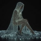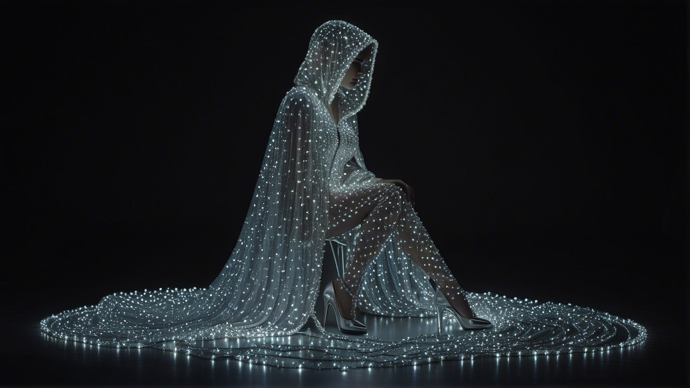 Prompt: A mysterious, elegant figure seated in darkness, draped in a hooded cloak made entirely of luminous pearls. Each bead glows softly, tracing the contours of the body with celestial precision. The figure’s face is obscured, its form sculpted from light and shadow—an ethereal being between glamour and void. High heels shimmer like moonlit glass, and the pearls cascade to the floor like liquid starlight, evoking the quiet majesty of divine artistry and hidden identity.