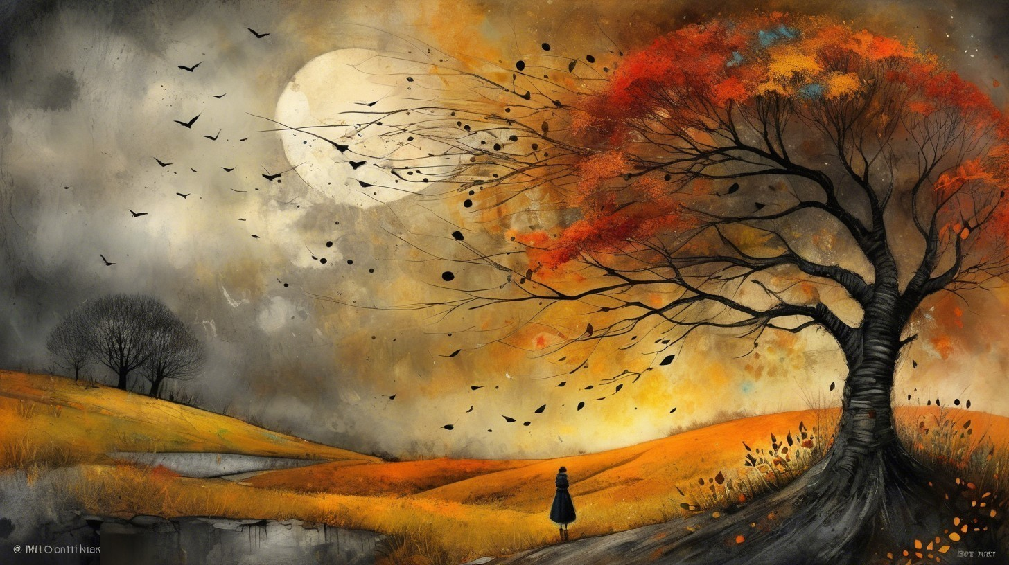 Prompt: At the center stands a solitary figure of a beautiful of a woman she full of life windblown and contemplative,, her hair and clothing trying to escape in the flowings of the unruly breeze. surrounded by rambling dead wild blooms, leaves and brambles scattered across the sand like living notes of color. The air full of life, carrying a sense of freedom and quiet release of self-acceptance. She stands In windswept surreal landscape inspired by the quiet yearning for freedom in a desert stretching beneath her feet, painted in tones of amber, rose gold, and pale ivory. The composition balances introspection and contrasts and textures of the human spirit set against the poetry of open space. The atmosphere captures both solitude and wildness. a visual ode to the soul unconfined, where thought and breath move freely.