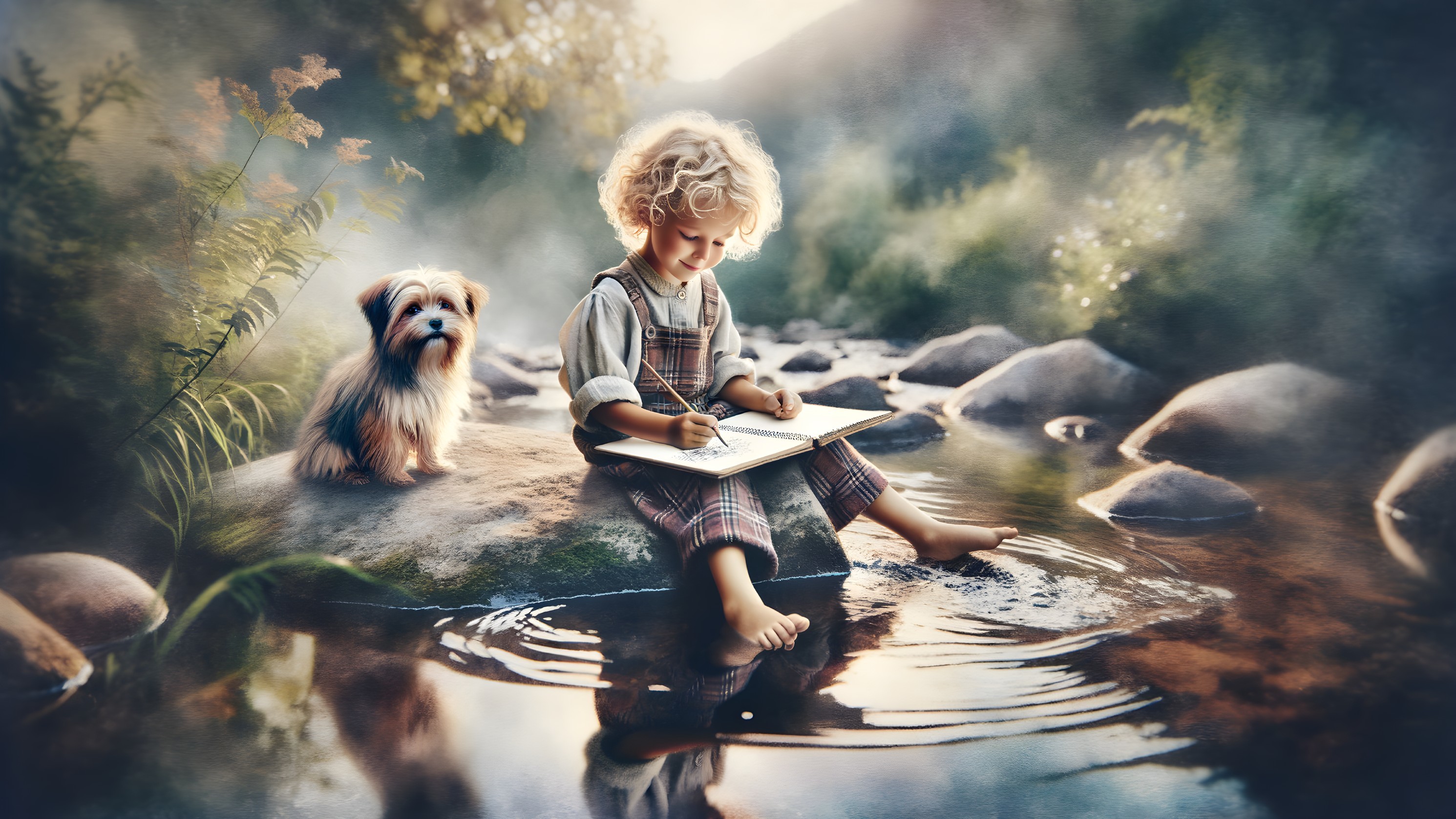 Prompt: A dreamy painting of an Image in the style of Thomas Kinkade + David A. Hardy + Carne Griffiths + Mandy Disher of a young child with curly blonde hair is sitting on a smooth, flat rock beside a gentle stream. The child is wearing a light-colored short-sleeve shirt and a plaid overall dress with straps. They are barefoot, with their feet dangling above the water, scribbling intently in an open sketchbook resting on their lap. The child has a joyful expression, absorbed in their drawing. Next to them, a fluffy dog with a mix of light brown and black fur sits on the rock, gazing curiously at the child. The background consists of soft greenery and blurred shrubs, creating a serene atmosphere. The water reflects the surroundings, with gentle ripples disturbing its surface. The overall scene conveys a sense of innocence and companionship in nature, illuminated by soft, natural light. style by Maike Plenzke x Iris Compiet