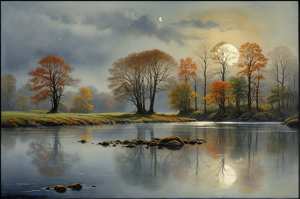 Prompt: Moon River - Moon over a misty river in autuumn. Colorful falling leaves . Watercolour by Alison Brady. Pastel colour, Arthur Rackham Gothic Watercolour Jean-Baptiste Monge Ernst Haeckel Minimalist Kay Sage watercolour art