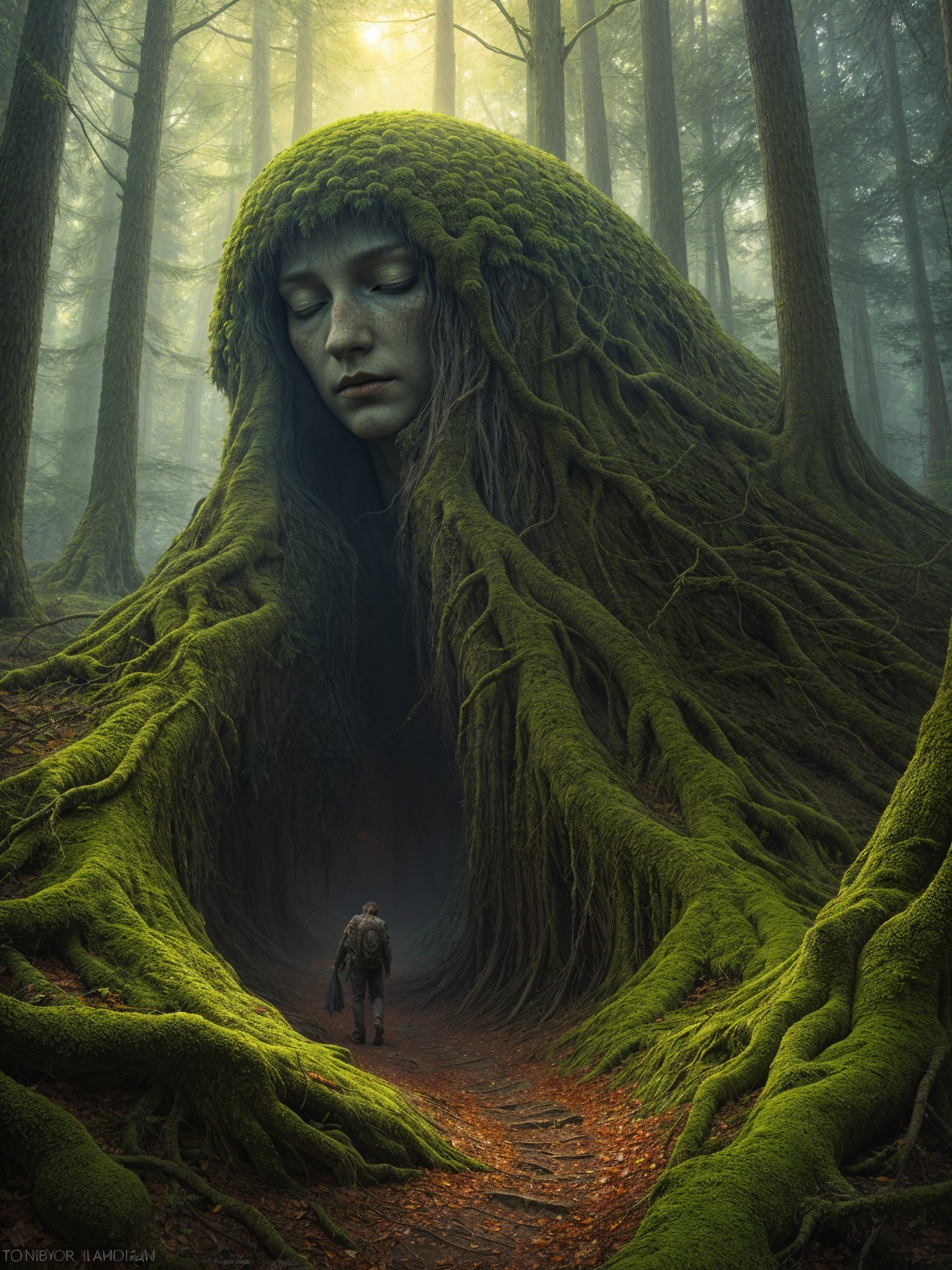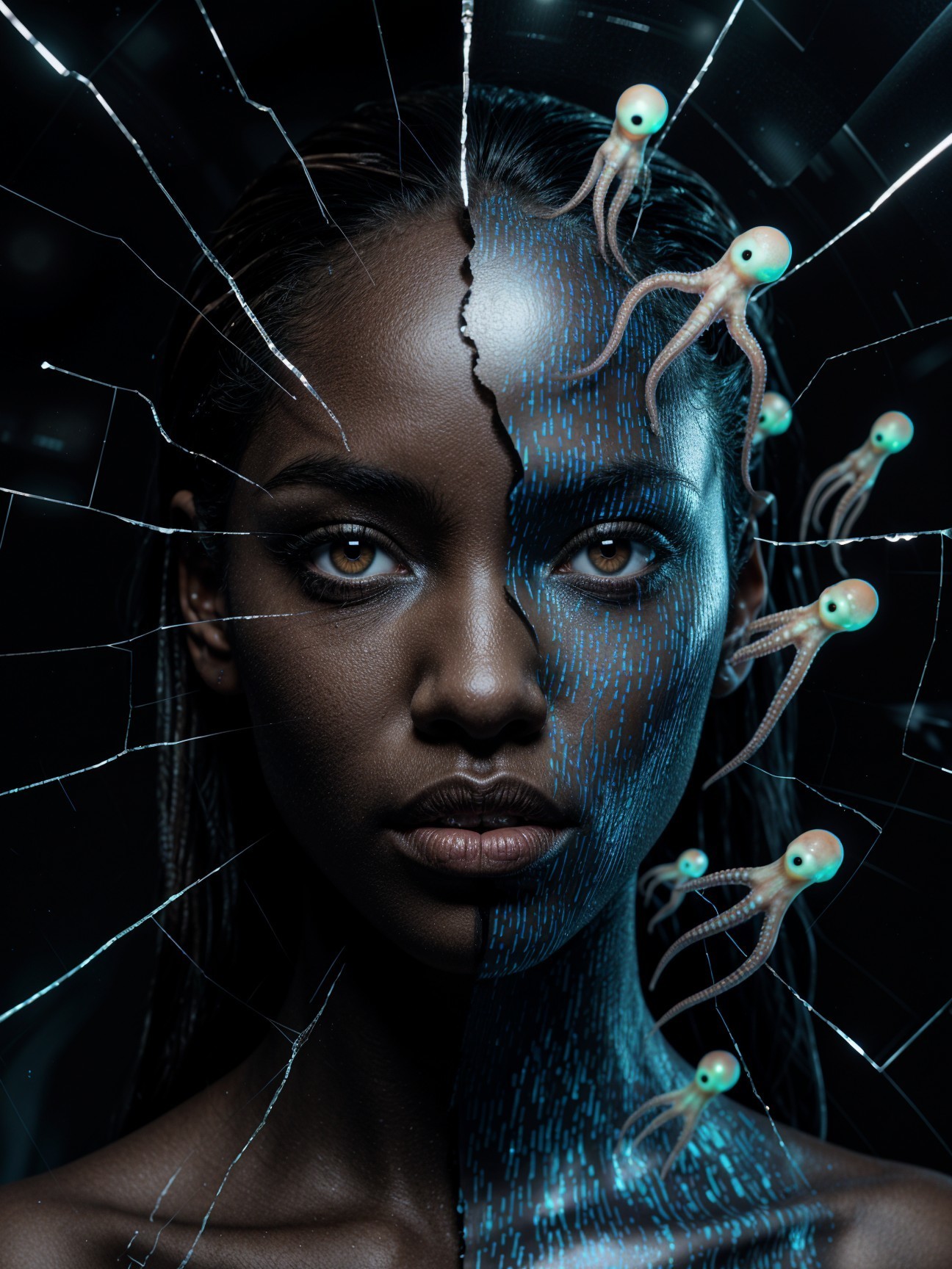 Prompt: {she is breakdancing!} undiscovered in the deepest depths of criminal blasphemy, perfect subsurface scattering (SSS)) A ferrofluid Xeno woman, jet-black with bioluminescent techno-organic patterns and striped hair, gazes contemplatively with piercing brown eyes, trapped behind a cracked digital screen. Her head morphs into a flock of Matrix-style ferrofluid octopuses soaring through an impossible optical illusion structure. One side of her face shows smooth, natural skin with subtle wrinkles, defined features, and full lips, while the other is a futuristic, glitching interface with electric blue circuits and pixelated skin. The scene merges subsurface scattering, multiple exposures, and overlapped images for a hypnotic, blurred ghosting effect.