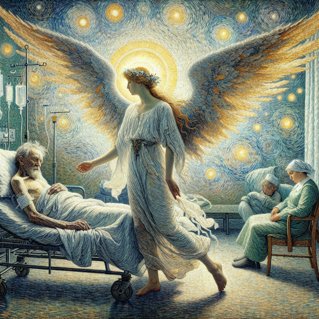 Prompt: A tapestry of a beautiful angel with large, gorgeous angel wings so he can fly. Highly detailed oil painting in (""full volume"), a stunningly beautiful work of art in which light and textures play a huge role, creating a magical, almost mystical effect. The angel with wings stands beside a sick old man in his hospital room. A nurse has fallen asleep in the chair in the old man's hospital room. Line drawing. Alcohol ink effect.