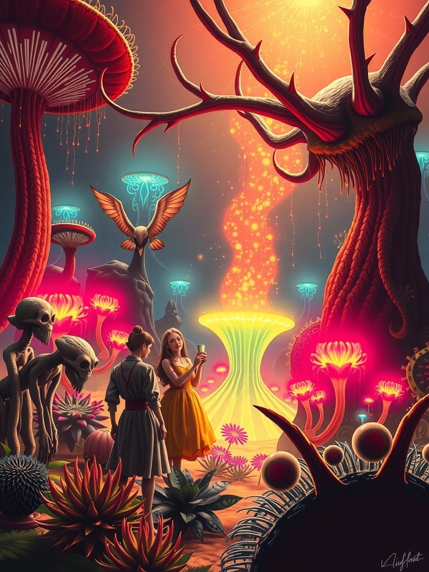Prompt: In glorious glowing neon Technicolor a Liminal, nostalgic, whimsical, odd figures frolicking with fauna among weird flora, Bosch, Ernst haeckel, Caravaggio, gustav klimt , octane render