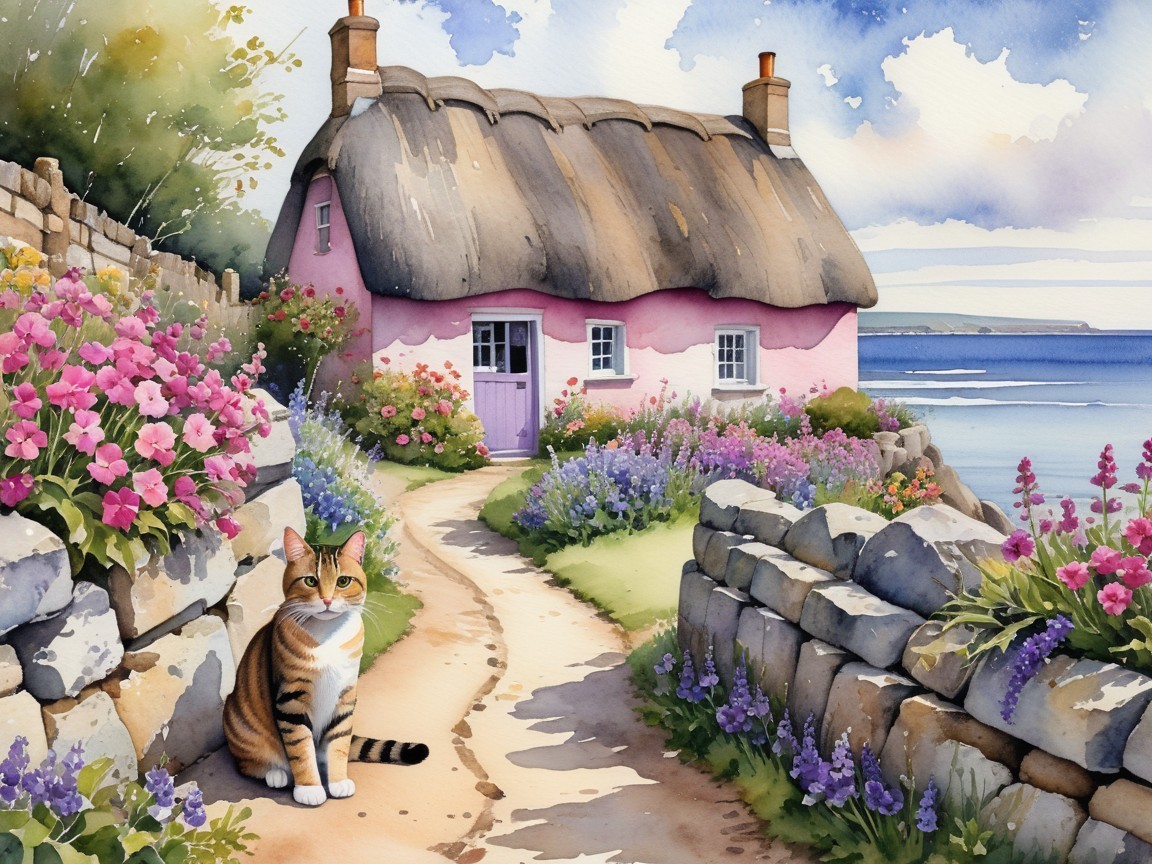 Prompt: Create a watercolour painting depicting a scenic coastal view featuring a quaint, rustic cottage with a thatched roof positioned to one side. The path leading to the cottage is lined with vibrant flowers in shades of pink and purple, enhancing the natural beauty of the scene. In the foreground, a striped tabby cat sits gracefully on a weathered stone wall, gazing out towards the beach. The ocean is visible in the background, with subtle waves lapping at the shore, and sailing boats anchored in the distance. The atmosphere is serene, with a soft, cloudy sky that diffuses light gently across the composition, creating a tranquil, dreamlike quality. Emphasise the contrast between the detailed flowers and the soft, flowing nature of the water and sky, merging both elements harmoniously.