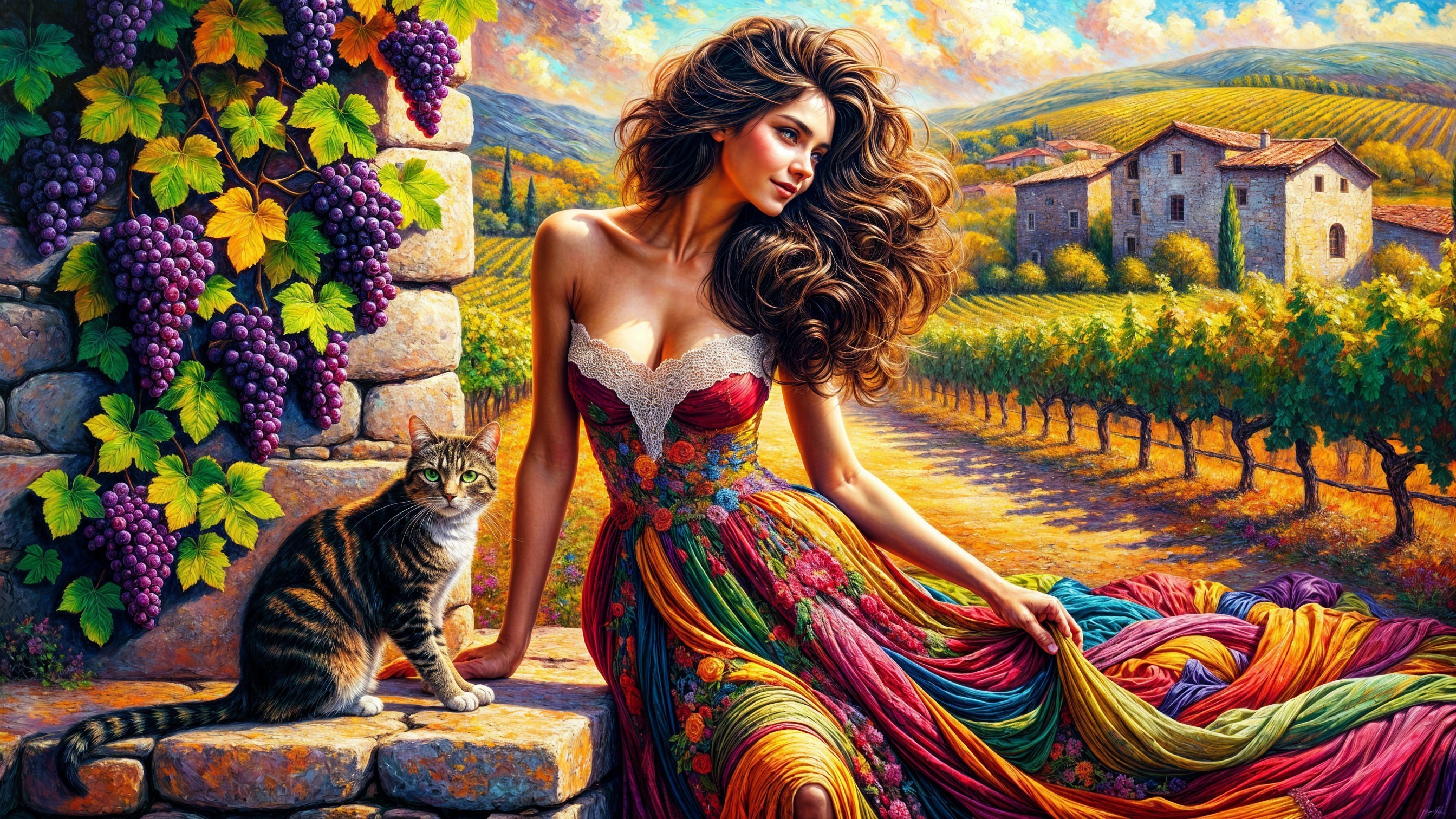 Prompt: A beautiful woman with long, flowing brown hair, wearing a vibrant, colorful, flowing sleeveless dress with a lace-trimmed sweetheart neckline, leans back against an old stone wall, a joyful expression on her face with a slight smile. Clusters of dark purple grapes and green leaves hang beside her. A tabby cat with green eyes rests comfortably in the foreground, looking directly at the viewer. In the background, a sunny vineyard with yellow and green foliage, distant houses with red tile roofs, and a clear blue sky. The scene is rendered in an impasto oil painting style, with rich textures and warm, inviting colors, creating a rustic and peaceful atmosphere.