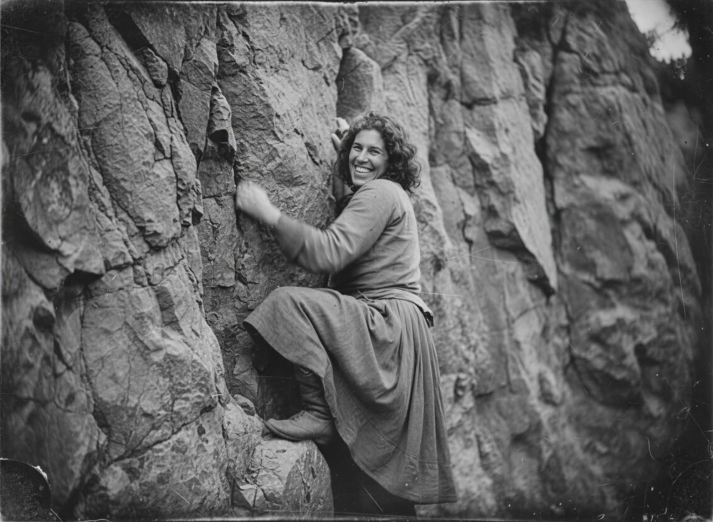 Prompt: A highly realistic 19th-century daguerreotype photograph, based on the provided reference photos. The woman is depicted climbing a rock face, looking over her shoulder to smile at the camera. Strong facial resemblance to the reference photo, same facial structure, eyes, nose, smile, chin, age, hair, and expression. The cliff face rises behind her. Authentic daguerreotype look: silver plate tonality, high contrast, soft focus, shallow depth of field, slight motion blur, chemical stains, oxidation marks, vignette, darkened corners, plate scratches, uneven exposure, historical photographic imperfections. No modern elements, no text, no anachronism, solemn and timeless atmosphere.