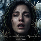 Prompt: Tears in translucent blue eyes, melancholic expression, delicate portrait of a woman, emotional depth, reminiscing the bird found under the window, ethereal double exposure effect, overlay of a mystical Eden with birds and sun, peaceful ambiance, misty atmosphere, subtle sunlight filtering through rose flower, raw authenticity, soft color palette, fog and smoke elements, blurred artistic touch, high-resolution detail, vulnerable emotional connection, created in the style of Alex Stoddard.