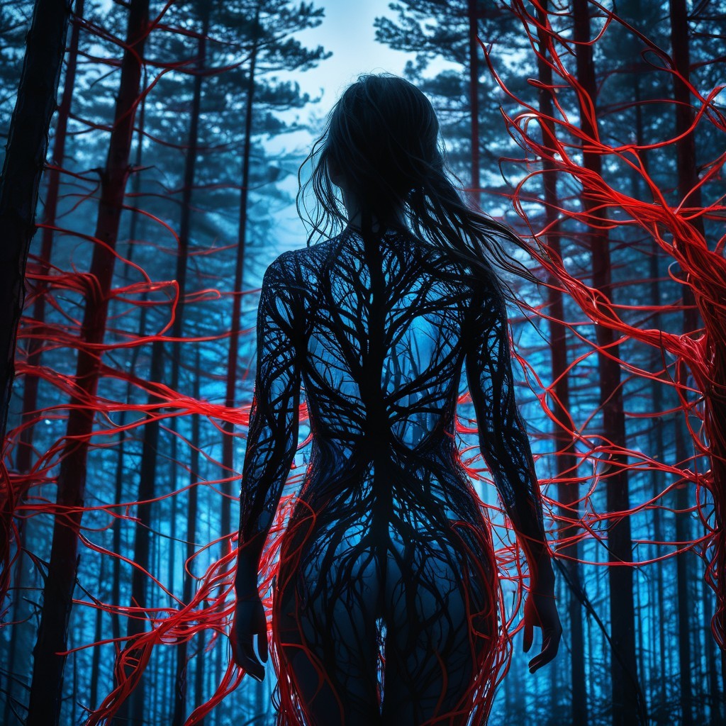 Prompt: Ethereal female silhouette composed of a tangled spruce forest, nightmarish double exposure effect, hyper-detailed wet, contrasting blue and red, dramatic, complex and distressing line, vast depth of field.