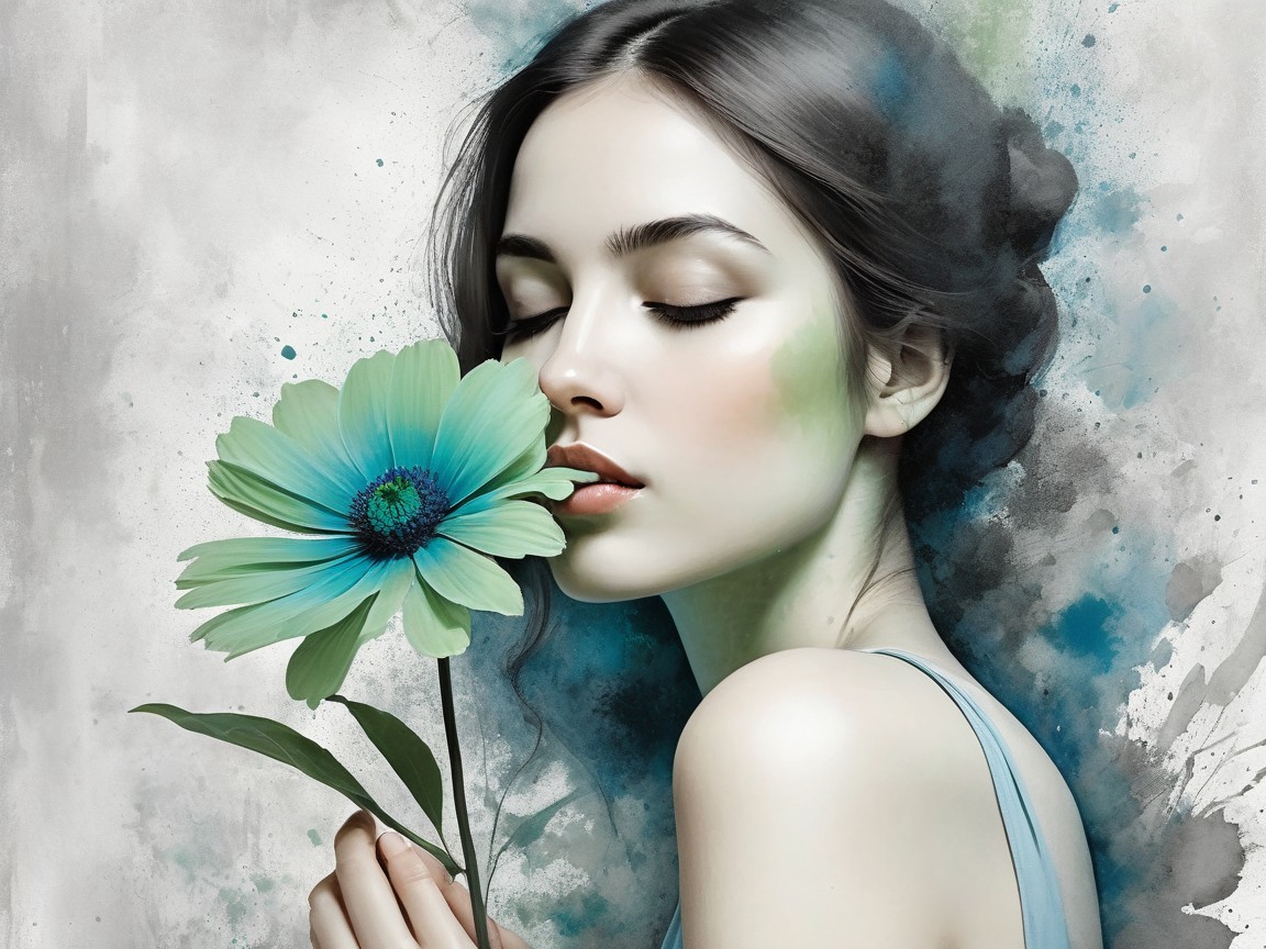 Her gaze is lowered, her thoughts distant, gentle wind stirs the petals into quiet motion.