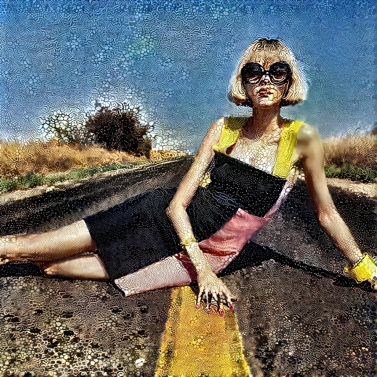 Prompt: Thorns and prickles on a wool sweater worn by a girl walking against a strong wind (graph neural network technology), a tree made of crumpled silver aluminum foil, steps made of raspberry marmalade. A melt-in-place painting, a landscape in the background. Folk art capturing a scene reminiscent of Art Deco, but with patchwork elements. Imagine a majestic scene paying homage to the splendor of Renaissance paintings, but with a touch of dark fantasy. The main themes are the sublime surroundings that suggest the absurd, the texture of balbashi on a washcloth.