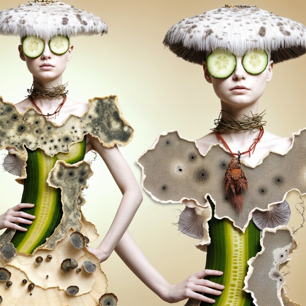 female model with an avant-garde dress made of torn microphotos (of detailed gray mold on the cap of an old boletus), with funky hairstyle(inspired by Russ Mills style) on her shorter white-to-violet hair and with cucumber slices on her eyes, with shabby red hue silhouette of a bird on a necklace woven from willow branches(palette of light golden ochre). Splendid view of the new fashion.
