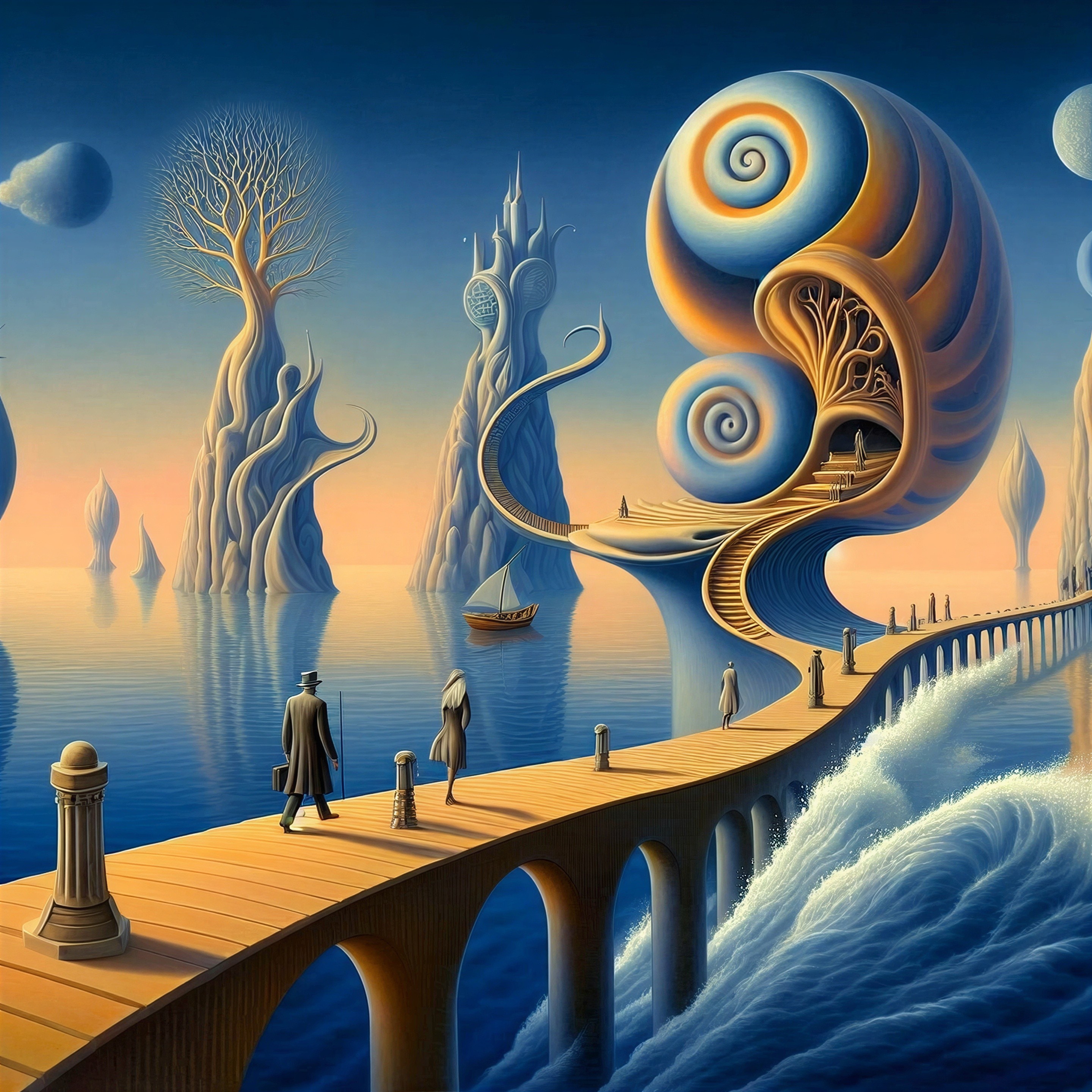 Create a surreal, highly detailed, textured, symbolic artwork — part fantasy, part philosophy, part dream.