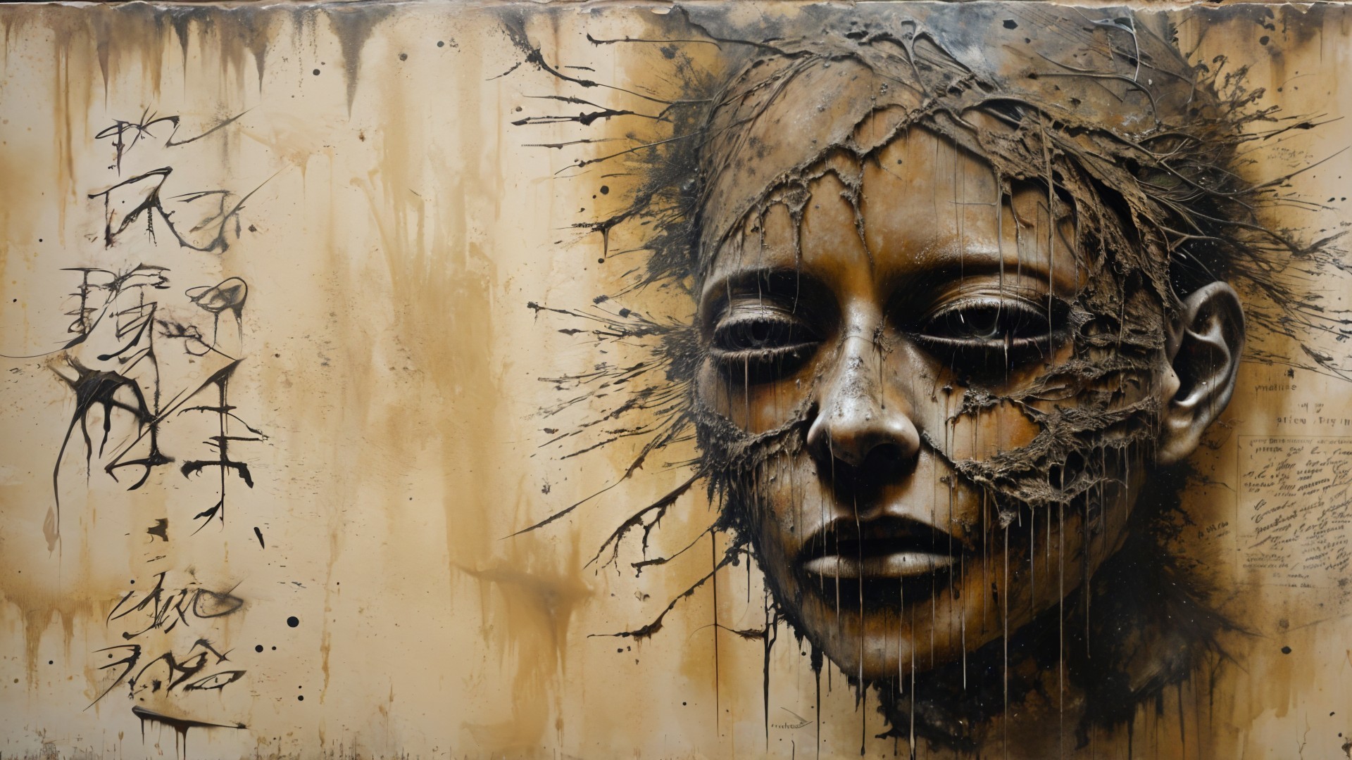Prompt: Oil painted image of A dark, haunting figure dissolves into cracked textures and ink splatters, standing in a surreal, decaying world. The humanoid form appears fragmented, as if eroding from within, surrounded by cryptic text and abstract stains. The background is gritty, like aged paper soaked in time, evoking themes of decay, vulnerability, and existential disintegration, in the style of dark surrealism.