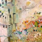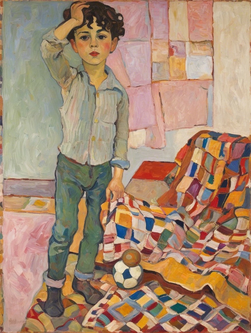 Prompt: Create an abstract oil painting by Matisse, Schiele, depicting an anatomically correct child playing with a ball in a room with colorful quilts.