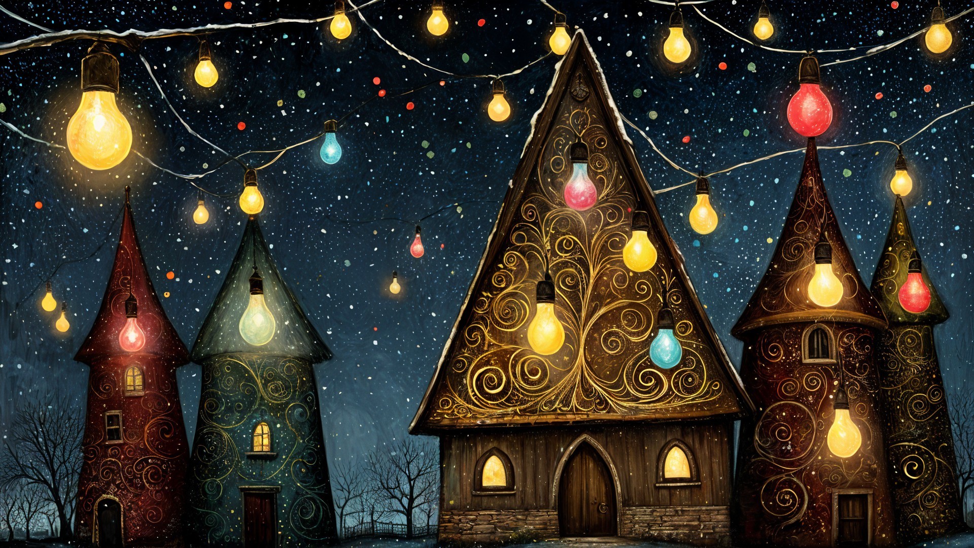 Prompt: A picture depicting a picturesque, richly detailed scene, similar to the works of masters such as Ivan Shishkin, Viktor Ngai, Gregorio Catarino, Cyril Rolando, Michal Karcz, Anato Finnstark, and Flavio Greco Paglia.A winter wonderland painting of a mystical landscape in breathtaking, beautiful detail, bathed in the soft glow of the golden hour. A rural winter scene in a village depicts two old, weathered wooden cottages with shingle roofs, surrounded by ancient trees. In the foreground, a winding country lane leads to a stone well with a wooden frame and a bucket hanging from a rope. Also visible in the foreground are a weathered wooden fence and a variety of grasses and shrubs. In the background, gentle hills covered with wintry trees and evergreen pines under an overcast sky complete the landscape. Style: Albert Bierstadt × Donato Giancola × modern high-fantasy landscape photography.