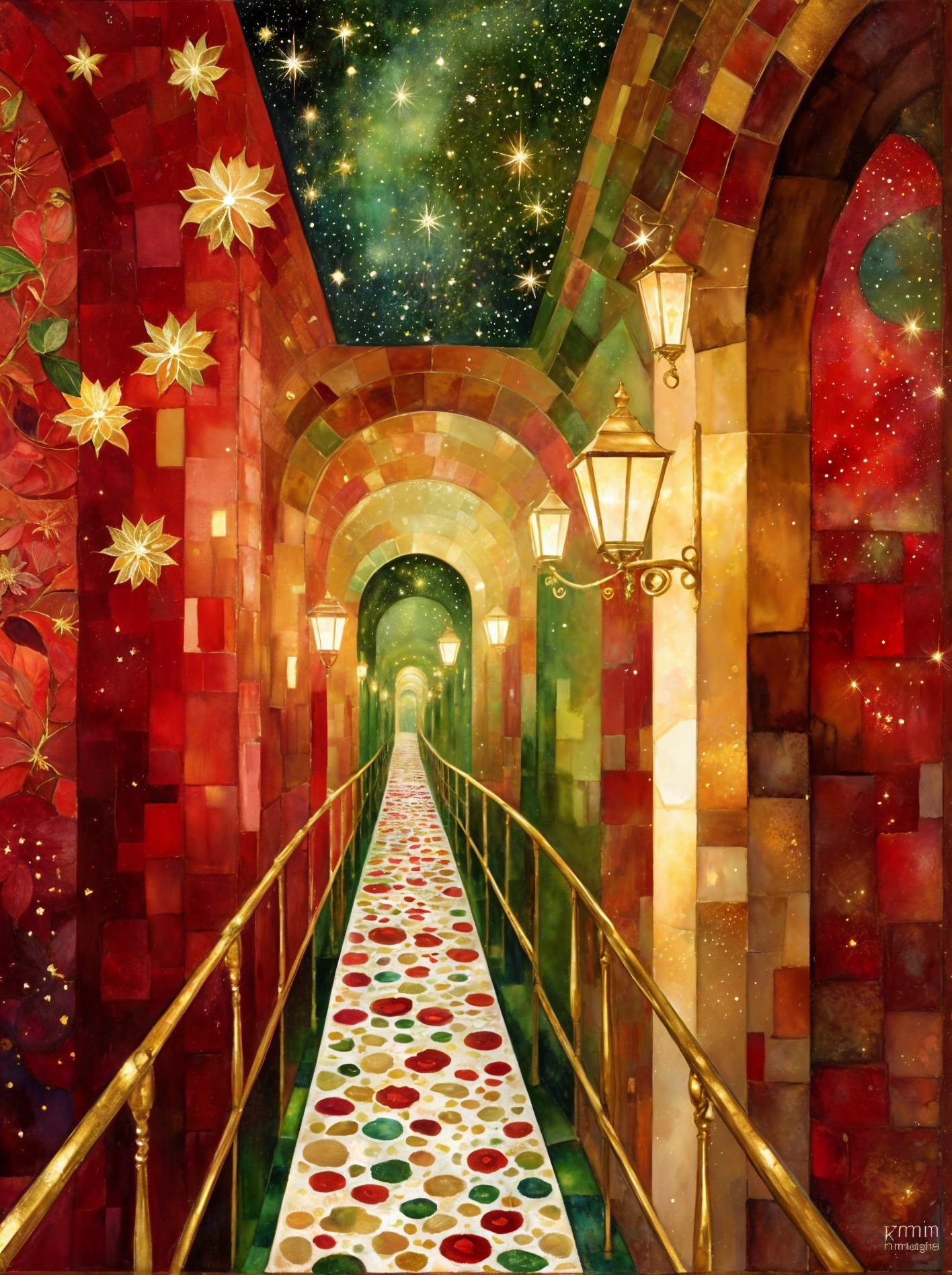 Prompt: Christian Schloe, Tom Everhart, Cy Twombly, David Downton, El Anatsui, Philip Taaffe, Jan Toorop, Koloman Moser: dappled light through fall leaves