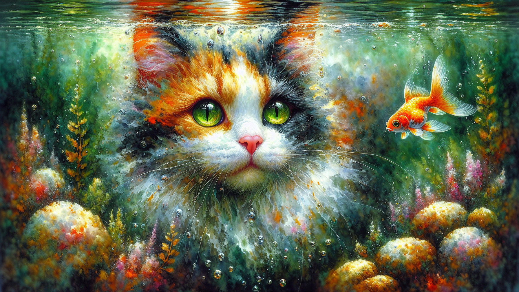Prompt: Golden ratio, ultra detailed watercolor painting, wet on wet painting, soft edges beautiful (((Masterpiece))) Create an image of a calico cat partially submerged in water, with its face and upper neck visible just above the surface. The cat has distinct patches of orange, black, and white fur, giving it a vibrant and colorful appearance. Its eyes are large and expressive, with a bright green hue that reflects the light filtering through the water. The background is a rich underwater scene, with lush aquatic plants and rocks in various shades that add texture and depth. To the right of the cat, a small goldfish swims gracefully, enhancing the aquatic theme. The surface of the water is slightly rippled, reflecting the green hues of the underwater vegetation. The overall composition should convey a sense of curiosity and wonder, capturing the serene beauty of this underwater Encounter. No frame no artifacts no words.