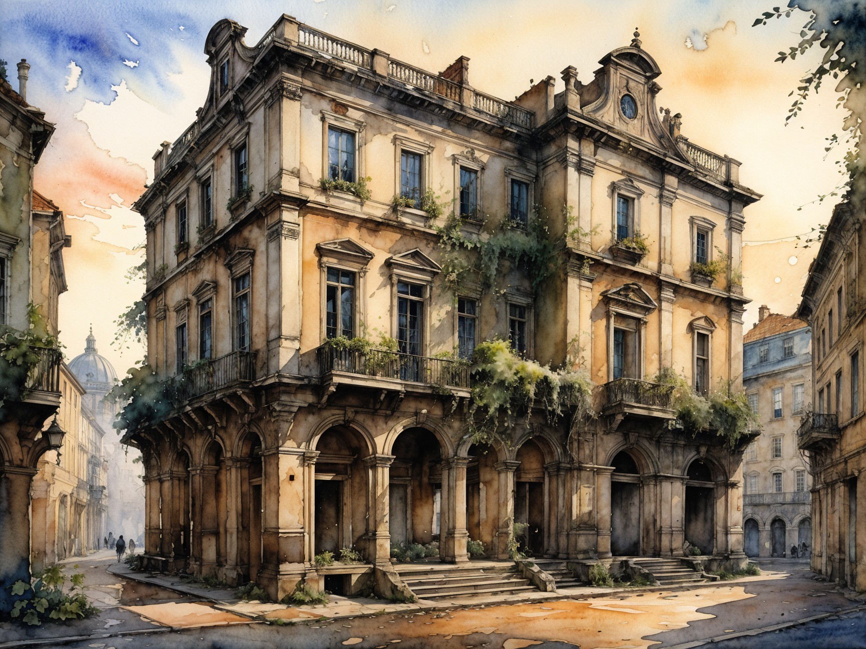 Prompt: A high quality watercolor and ink wash painting of an ancient, overgrown city square at twilight, with crumbling baroque architecture resembling the style of Thomas Wells Schaller. The scene captures the essence of decay and history, showcasing intricate details of the weathered buildings enveloped by cascading vines and foliage. The soft hues of twilight cast a mesmerizing glow over the scene, enhancing the sense of nostalgia and mystery that permeates the atmosphere. The style mirrors the masterful techniques of Thomas Wells Schaller, known for his atmospheric and evocative architectural watercolor paintings. The interplay of light and shadow, the delicate blending of colors, and the expressive brushwork all contribute to the enchanting beauty of this artwork. The viewer is transported to a bygone era, where time stands still and the whispers of the past echo through the cobblestone streets.