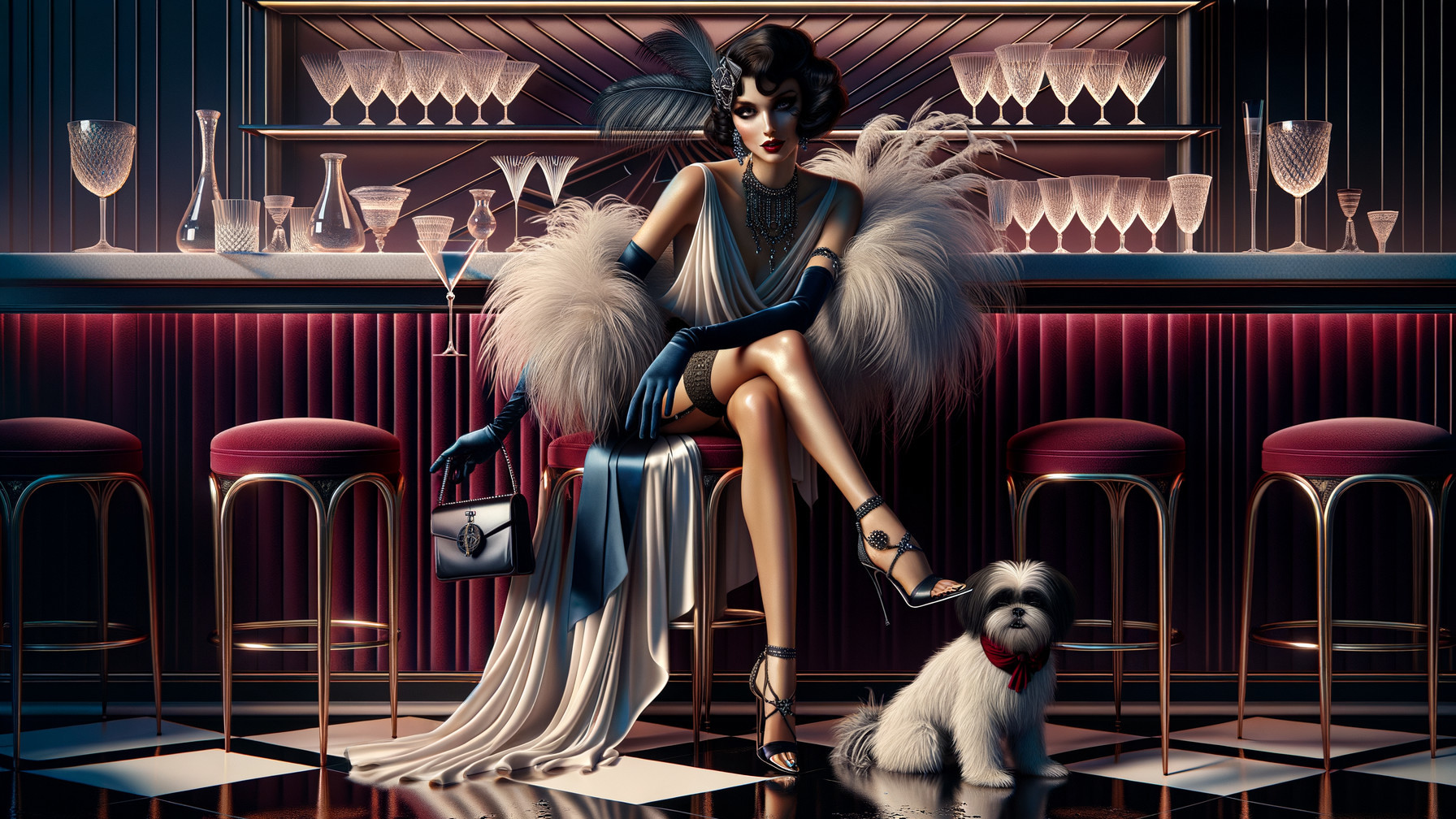 Prompt: A louche Art Deco fantasy where a dark-haired woman perches on a crimson barstool, her crossed legs sheathed in white chiffon that pools like spilled milk around stiletto heels. Feathers flutter at her shoulders and a blue ribbon cinches her waist like a stolen secret, while a jet-black headpiece crowns waves of ink-black hair. Her smirk holds the weight of unspoken conquests. To her left, a terrier with a scarlet collar sits alert on the counter; to her right, an empty barstool bears a sleek black handbag. Behind them, shelves of crystal stemware gleam against a geometric mauve backdrop, every curve and angle polished to a liquid sheen that whispers of jazz-age decadence.