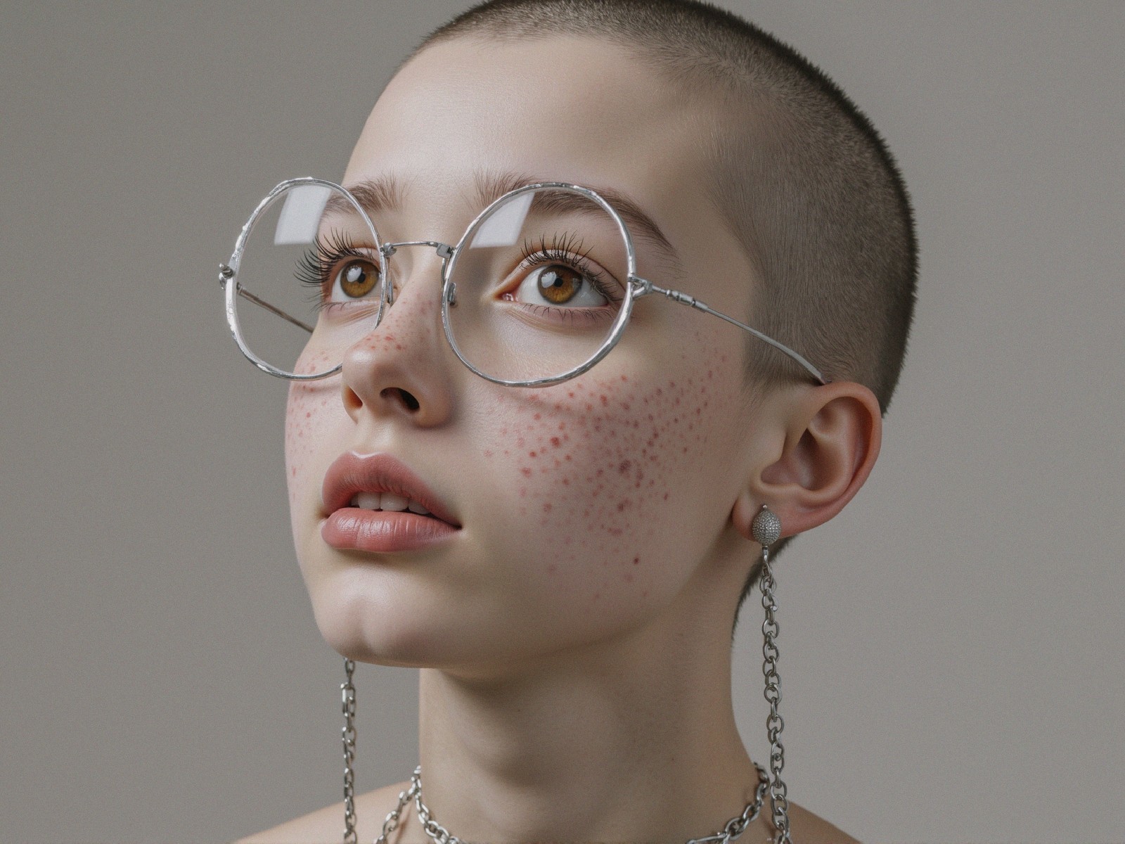 Prompt: A highly detailed and stylized portrait of a young person with a shaved head and numerous freckles. The subject gazes upwards with wide, expressive eyes of a warm brown color, enhanced with thick, defined eyelashes and eyebrows. They wear a minimalist silver accessory that arches across the face, seemingly functioning as glasses. The skin has a smooth, almost porcelain-like quality, with a subtle sheen to the lips and a soft blush. They wear a silver choker. The background is a soft, gradient wash of neutral colors, highlighting the subject's features. The overall style is a blend of hyperrealism and stylized fantasy, with an emphasis on soft lighting and clean lines, reminiscent of digital art with a touch of surrealism. The image should be rendered with a high level of detail and a focus on the subject's face.