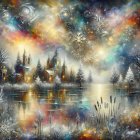 Prompt: Double exposure, a 3D miniature on a cup on the table, a 3D microcosm on the table inside the cup, an isometric, volumetric, convex, colorful digital, cute white teddy bear on the edge, looking at the northern lights, stars, falling, sparkling neon snow, fluffy pine trees, a lake from the depths, hieroglyphs, ornamental patterns, clouds rise into a hologram of the moon, and everything comes to life volumetrically on a piece of paper and extends beyond the cup, soft sfumato, holography, decoupage, aerial, deep.