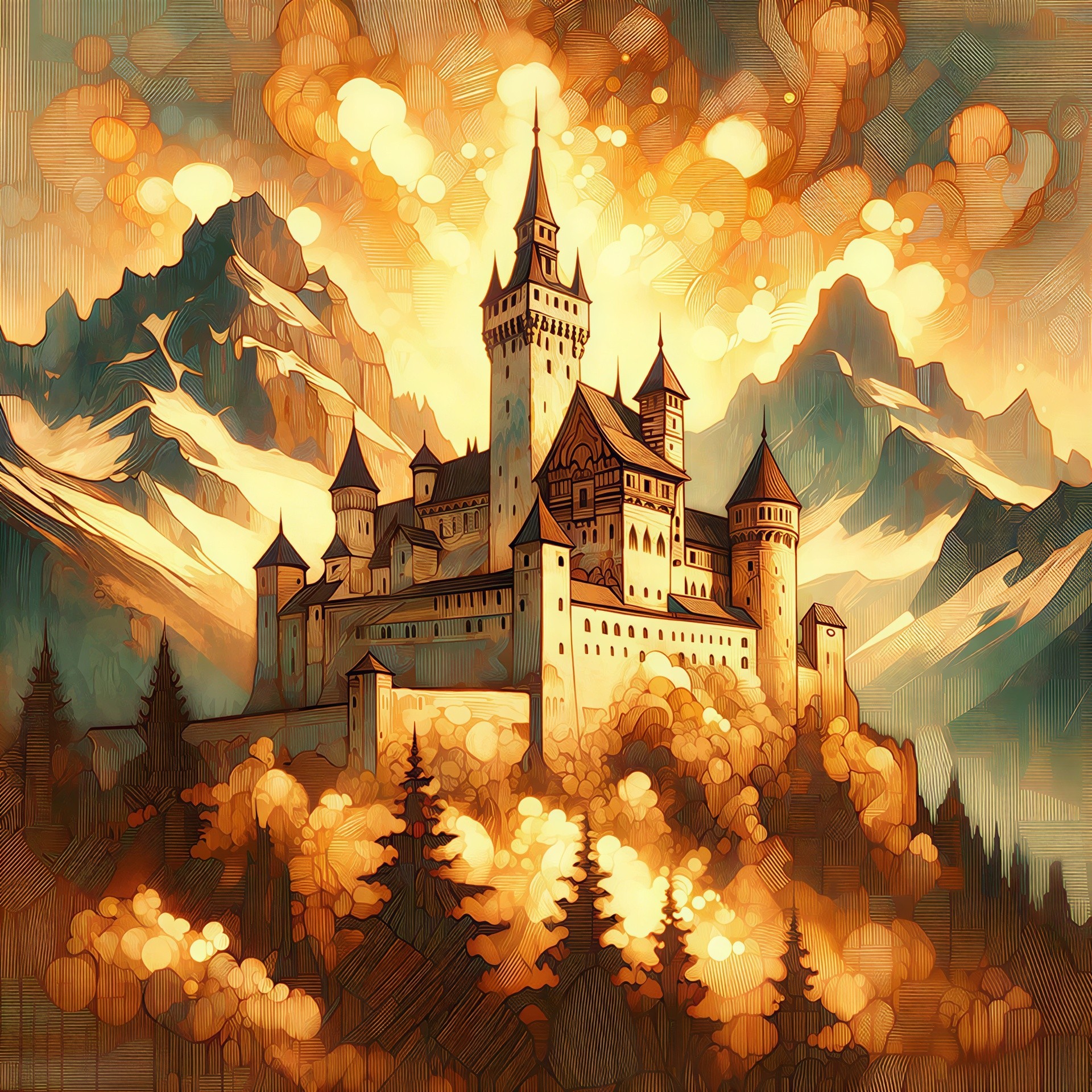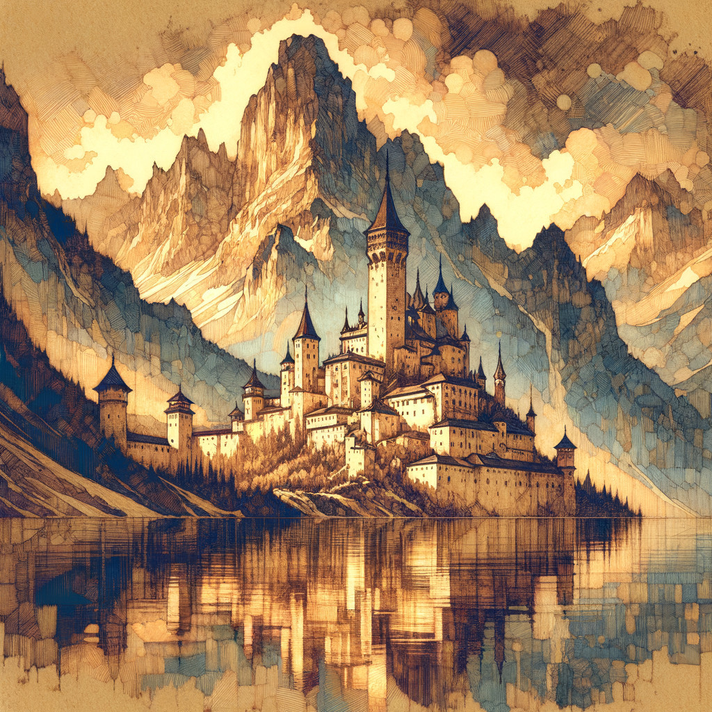 Prompt: A pyrography picture of a mountain castle. The mood is mystical and regal, with soft golden light reflecting off the walls. Wet-on-wet watercolor painting in the style of Bohdan Pylypiv — detailed woodburned artwork with elegant contours and expressive shading. The overall tone is sepia, emphasizing the natural grain and burn patterns of the wood, creating depth, warmth, and emotional resonance. The main tones are blue, deep blue, indigo, white, gold and pink. Original prompt by Mariia93