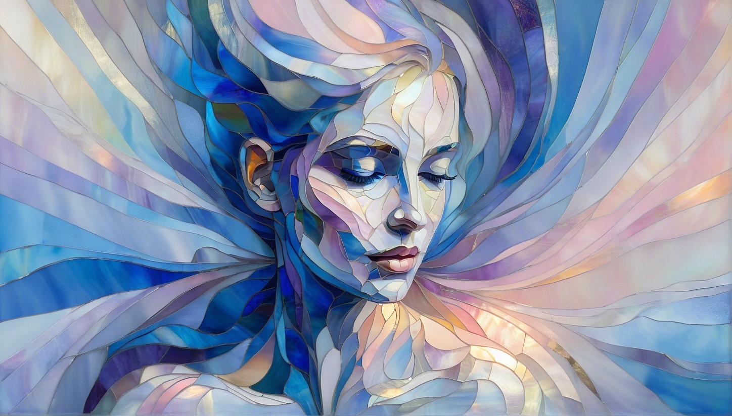Prompt: A vibrant, ethereal portrait of a woman's head and shoulders is depicted in a stained glass or mosaic art style. Her closed eyes and serene expression suggest a sense of calm or introspection. The colors are predominantly cool tones of blue, purple, and white, with warm highlights of subtle pink, orange, and yellow creating a glow around her head and in the background. Her hair appears to be flowing outwards in wavy, translucent shapes, blending seamlessly with the background which features soft, iridescent, and swirling patterns. The shapes comprising the individual elements of the portrait and background are distinct, outlined by fine lines, giving the impression of separate pieces of glass or tesserae. The overall texture seems slightly granular or shimmering, enhancing the mosaic effect. The light appears to emanate from within the artwork, giving it a luminous quality, especially around her lower facial area and shoulders.