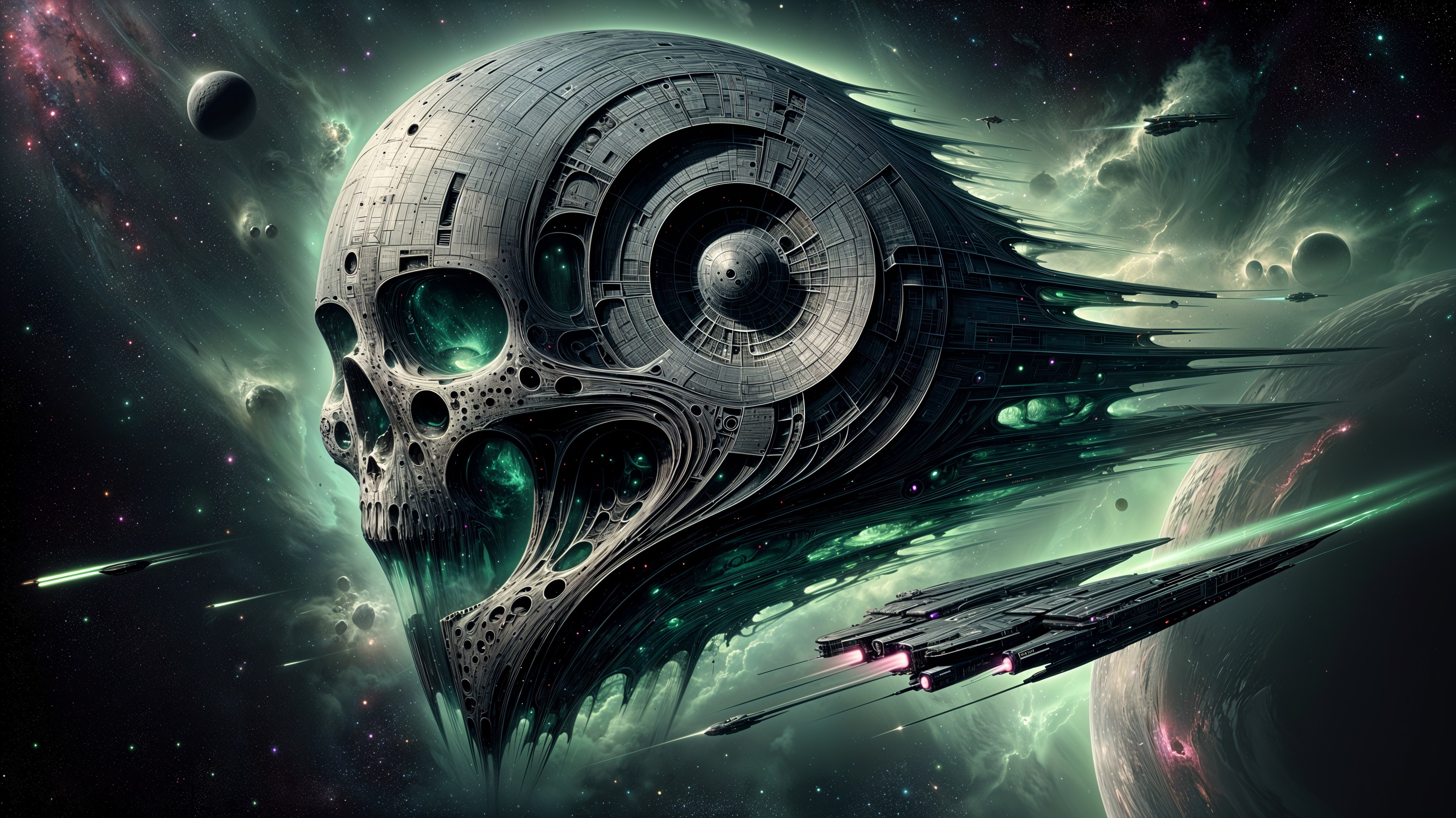 Prompt: A masterpiece of necrotic futurism. A futuristic, wedge-shaped, multi-tiered, black, necrotic-style spaceship flies through a space dotted with dim stars. The rounded cockpit at the front resembles a skull. The skull's eyes and the ship's numerous portholes glow with a dim green light. A light, greenish, glowing mist is visible around the spaceship, creating a long trail of swirling, ghostly, glowing light green mist with mysterious, faded pink highlights behind it. A black, lifeless planet is visible nearby in space.