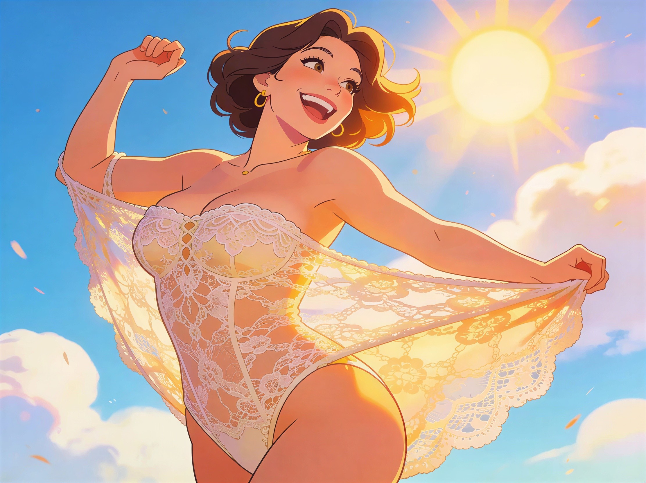Prompt: A vibrant scene adult woman in 36 years old in a huge supersize strapless lace swimsuit dances joyfully amidst a sunny day Style pin up cartoon