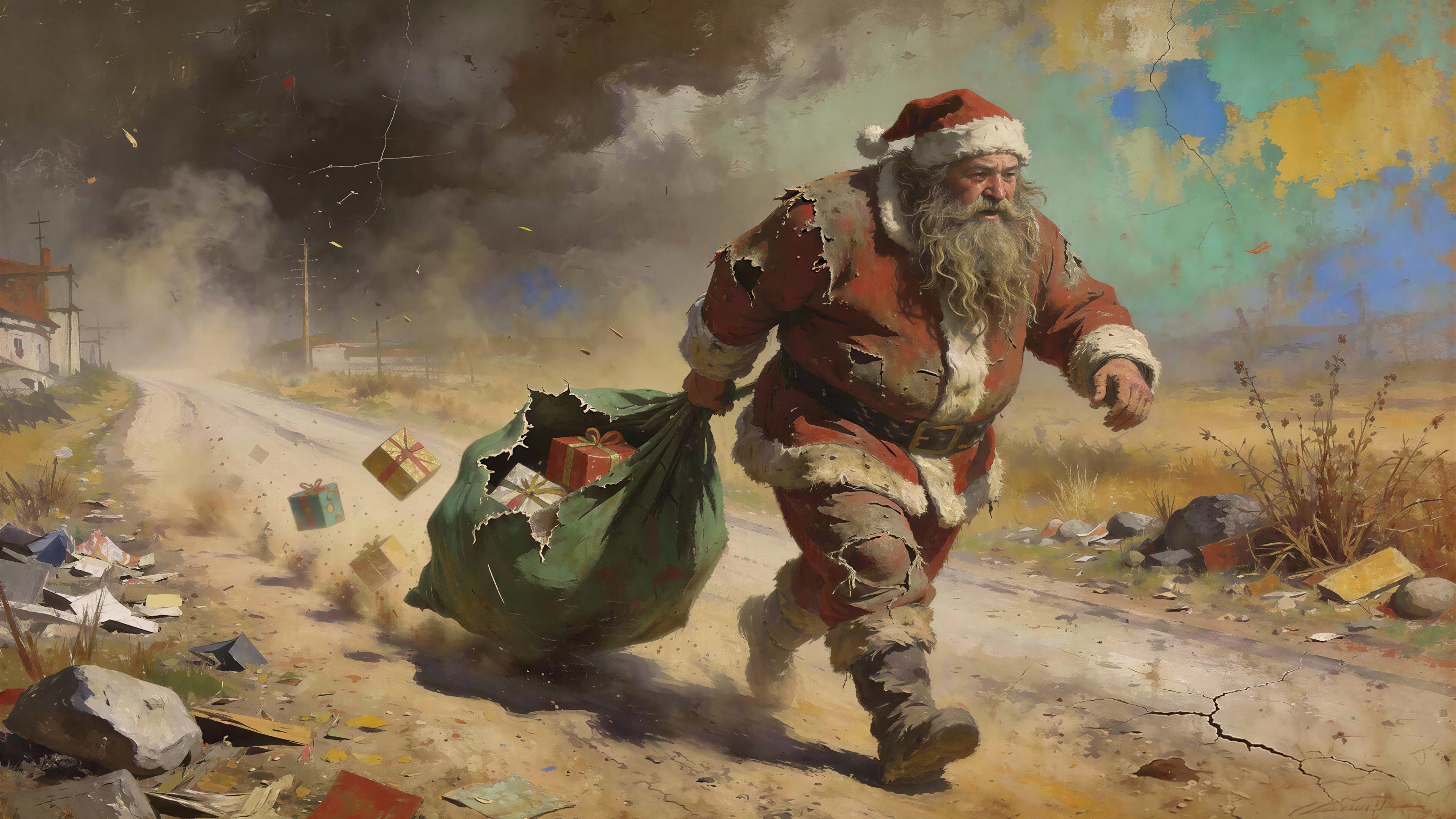 He is dressed in a dirty torn Santa costume.