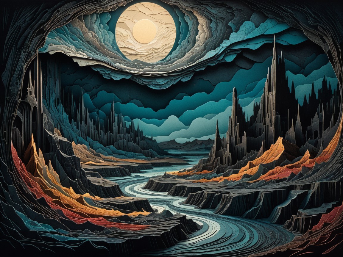 Prompt: A surreal landscape where abstract shapes are formed from layered and torn paper. The scene depicts a world of deep mystery, with moody lighting casting dramatic shadows across the textured paper surfaces. The style combines highly detailed etching techniques with surrealist elements to create an unsettling yet captivating vista.