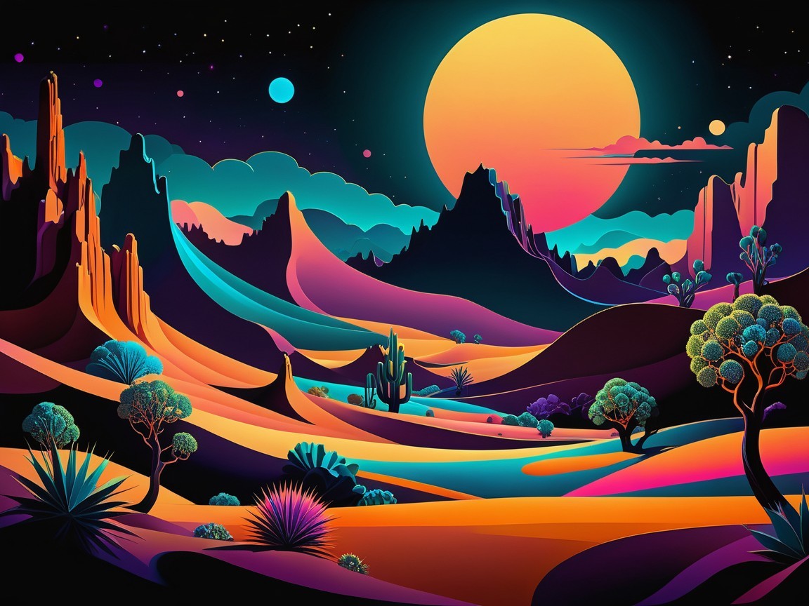 Prompt: surreal desert landscape by Lotte Reiniger depicted in the perfect fractal style of Mandelbrot, Julia, Wassily Kandinsky, Alphonse Mucha, glowing neon colors, dark background