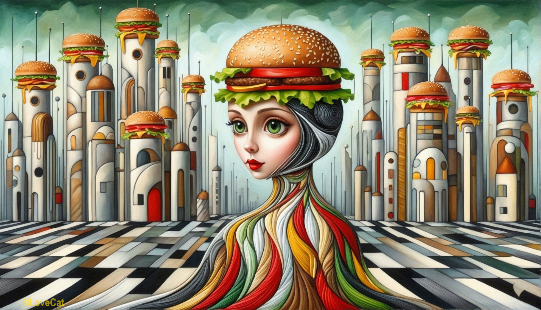 Prompt: abstract painting using orange, lime green, turquoise, black and white, 3 Basquiat style women (3) sitting at an outdoor cafe in a city, black and white illusion lines