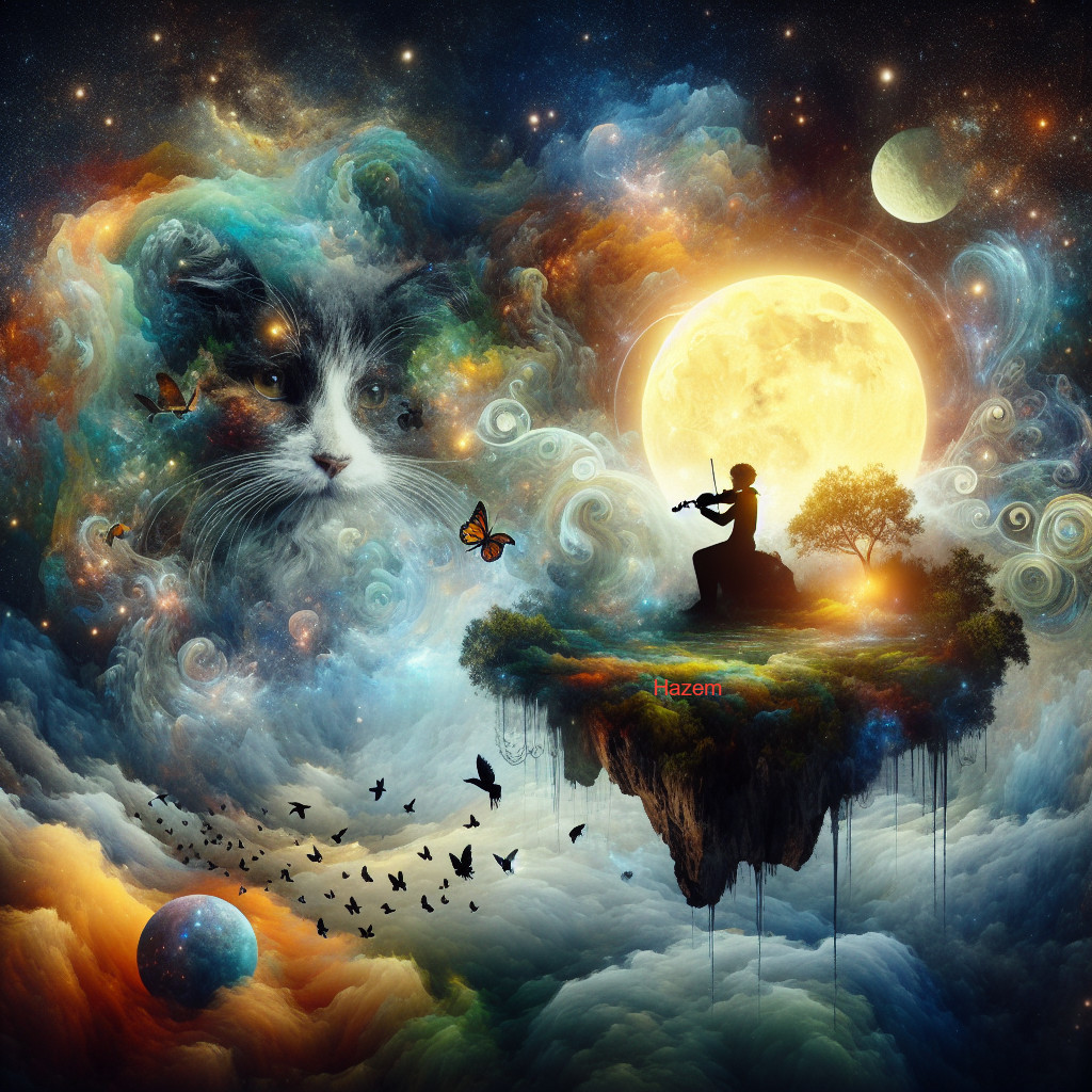 Prompt: Floating stone island, surreal fantasy landscape, modern abstract twist, double exposure effect, young violinist silhouette, shaggy cat companion, massive light yellow moon glow, ethereal birds and butterflies, mystical fog and smoke, swirling fractals and colored dots, twinkling stars and blots, artistic touch of Andre Kohn and René Magritte, dreamlike ambiance, intricate details, vibrant colors, magical lighting, moonlit sky, Artstation.