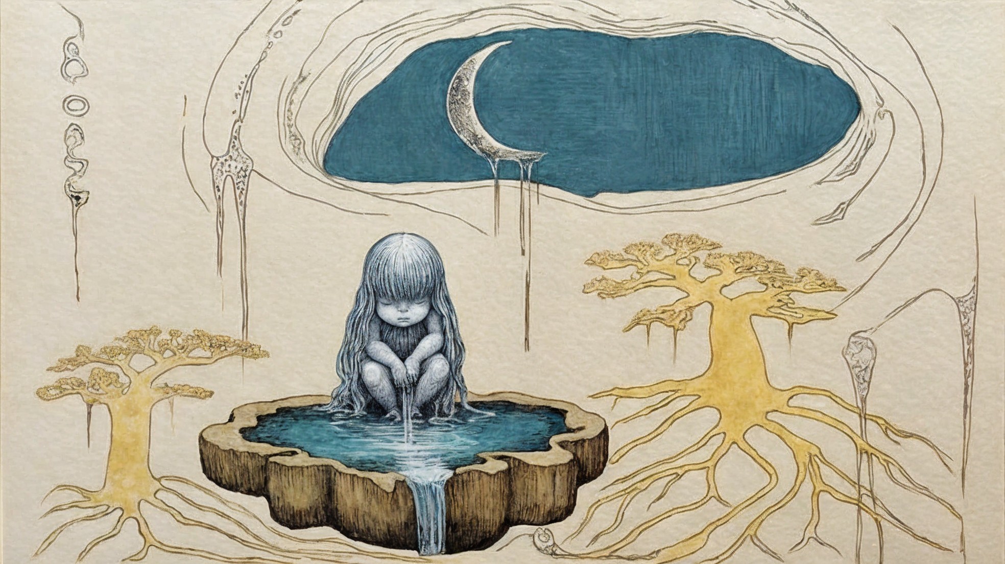 Prompt: Create an image that has a high degree of abstraction, as in Zen art. It should show an abstractly suggested turquoise-blue cave. In the foreground, depict an elemental child with long, flowing hair, sitting cross-legged sitting in a natural fountain, a rough stone sculpture with a water source flowing from its center, taking a bath in Moonwater.