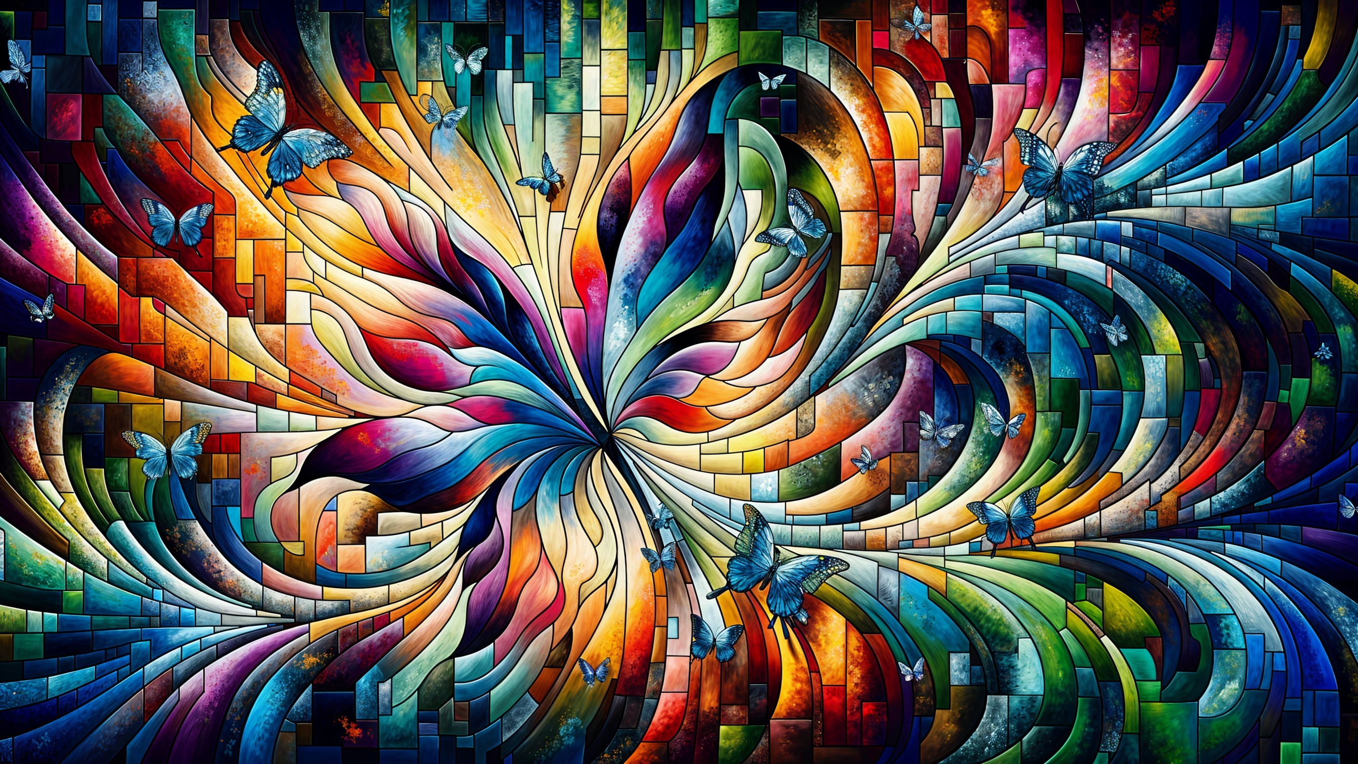 Prompt: A masterpiece of abstract neon fragmented mosaic cubism with the effect of smooth, shiny glass. A floral symphony with contrasting butterflies. Full-size image.