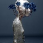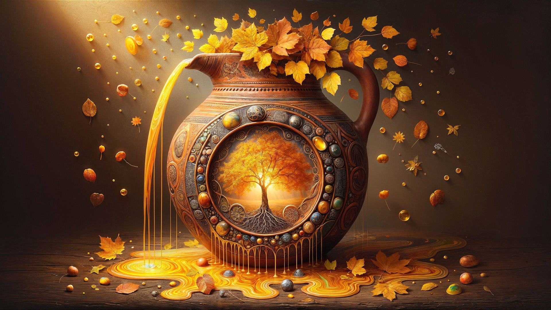 Prompt: This clay jug is a beautiful example of ethnic art, majestic and ancient, with a bouquet of autumn leaves dripping yellow into yellow puddles, drop by drop. Double exposure: the tree of life within the jug, metal elements, textiles, and silver filigree. Rich terracotta hues blend seamlessly with the yellow autumn leaves, shimmering with iridescent patterns. The tree of life is woven into a surreal landscape. Illuminated by an aerial light source, the scene casts soft shadows that highlight the intricate details of the jug, leaves, tree of life, and surreal landscape. The double exposure effect, an image within an image, evokes the influence of the Impressionists, the complex textures, and the harmony of the jug. Leaves, tree of life and autumn surreal landscape, mix of styles, Rembrandt, Monet, magical realism, melting oil gouache, acrylic, high contrast, colorful polychrome, highest detail, highest quality.