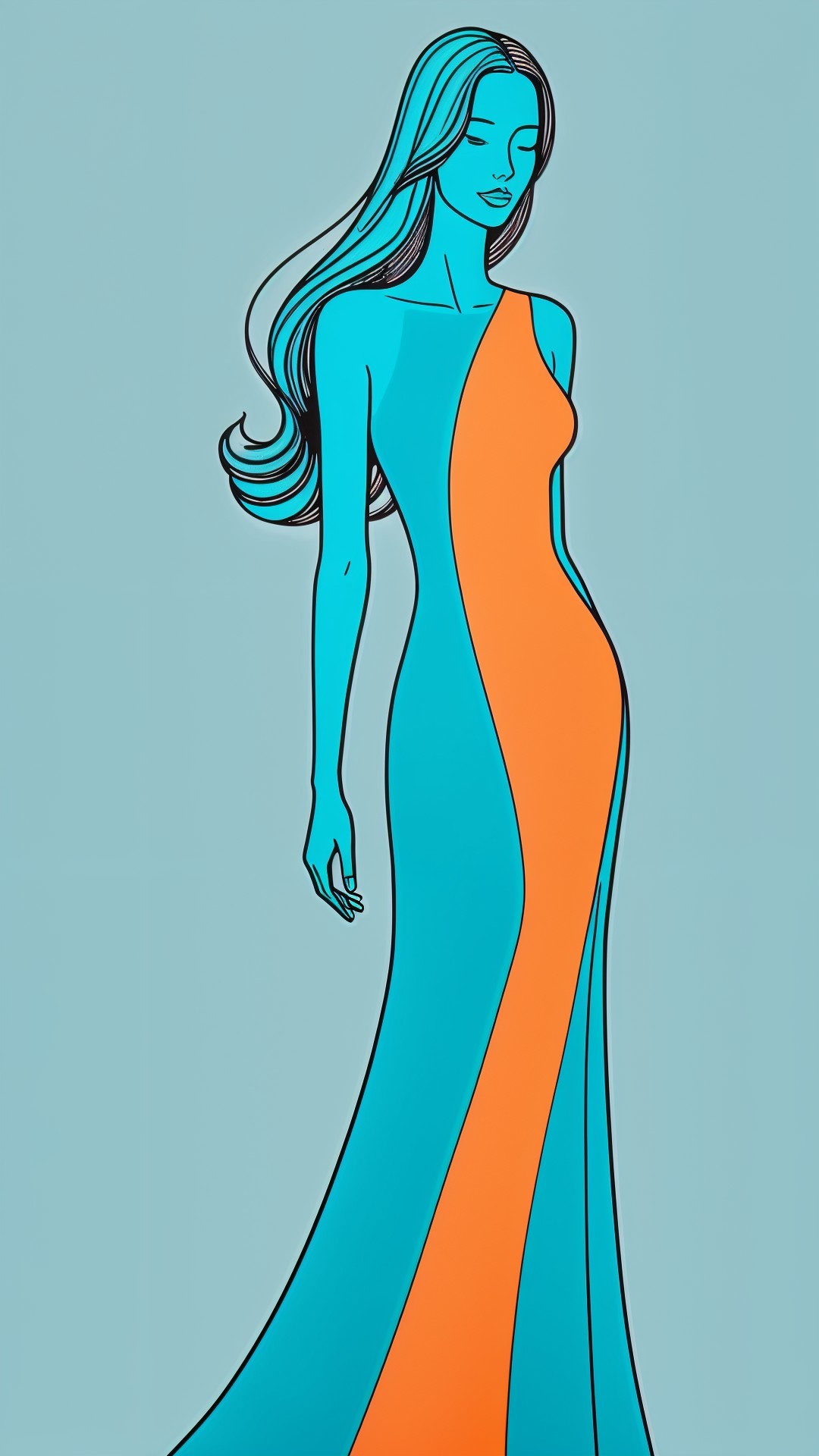 Prompt: Create an abstract line drawing of a slender female figure standing confidently. The woman has long, flowing hair colored in shades of blue, cascading down her shoulders. Her body is portrayed in a minimalist style, with smooth curves. She is wearing a dress