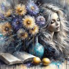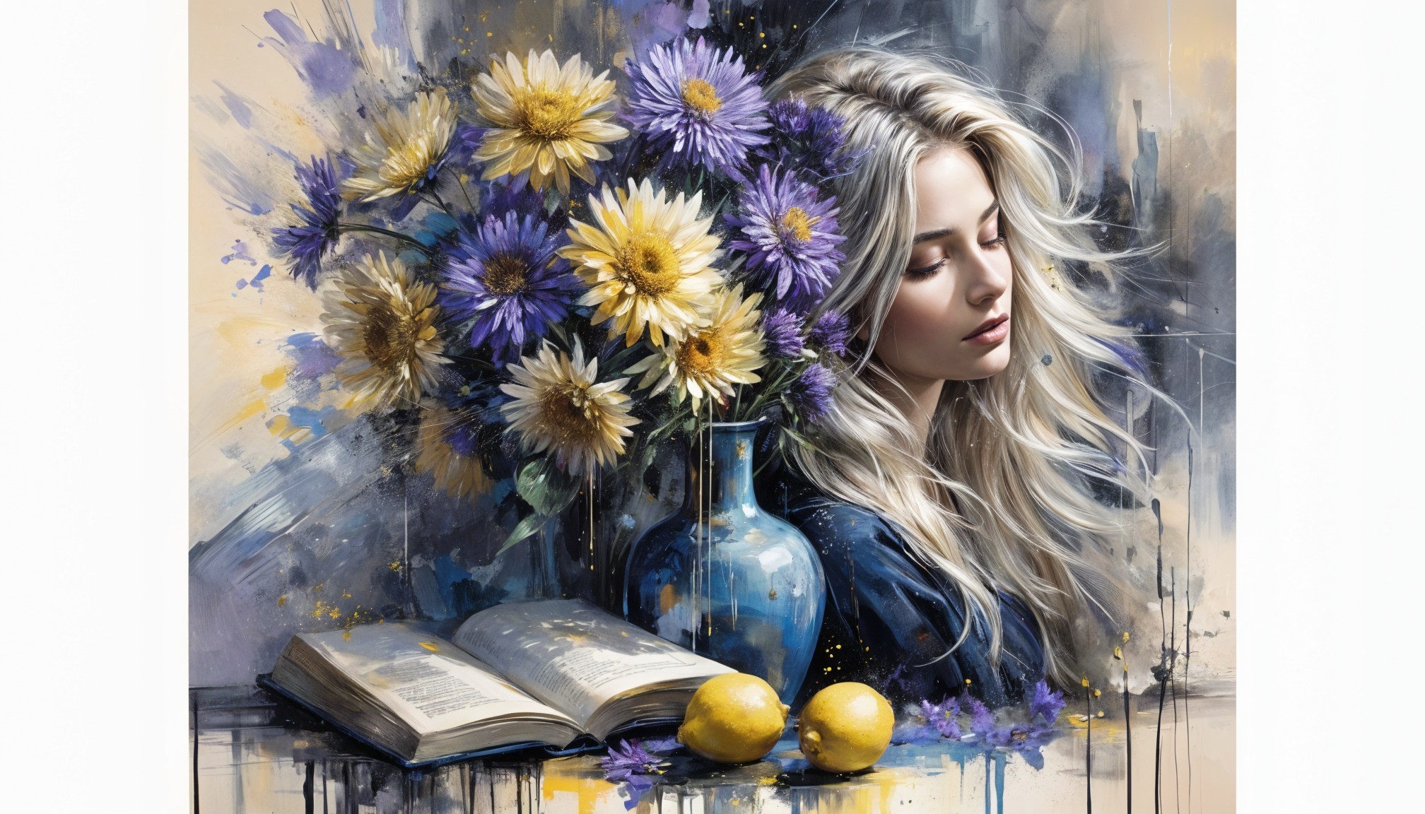 Prompt: Abstract acrylic and ink, splatters, smudges, impressionistic brushstrokes, the dynamic appearance of a beautiful blonde. A blonde woman with closed eyes sits in front of a still life with a blue vase of golden and violet asters, three lemons, and an open book. The flowers glow softly in the dim light, their petals shimmering with silver foil reflections. The woman’s serene face and flowing hair blend with the textures of dripping black ink and misty turquoise paint splashes, as if emotion itself became visible on the canvas. The atmosphere is intimate and poetic, filled with fragrance, memory, and silence. Palette-knife acrylic texture, metallic foil, dripping ink, cinematic lighting, deep contrasts of blue, gold, and ivory tones. Krinichka Aesthetic, ultra-detailed, trending on ArtStation.