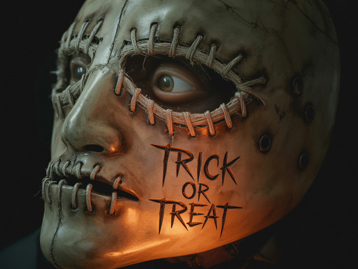 Prompt: A photorealistic close-up of a handmade leather mask, stitched together with rough twine and metal staples. The surface is weathered, greasy, and dark, with uneven seams and small patches of dried blood. One glassy eye peers through a torn hole. Dim orange light from one side reveals chilling texture; the rest fades into darkness. The words “Trick or Treat” appear carved or burned into the leather below. Ultra-detailed 8K realism, cinematic lighting, grim atmosphere.