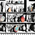 Prompt: Contour Lines, pencil drawing, a shelf with many compartments, full of vases in all shapes, thick, thin, long, short, bottles, some books and knick-knacks, dolls, teddies, extremely detailed, in the style of Didier Lourenço