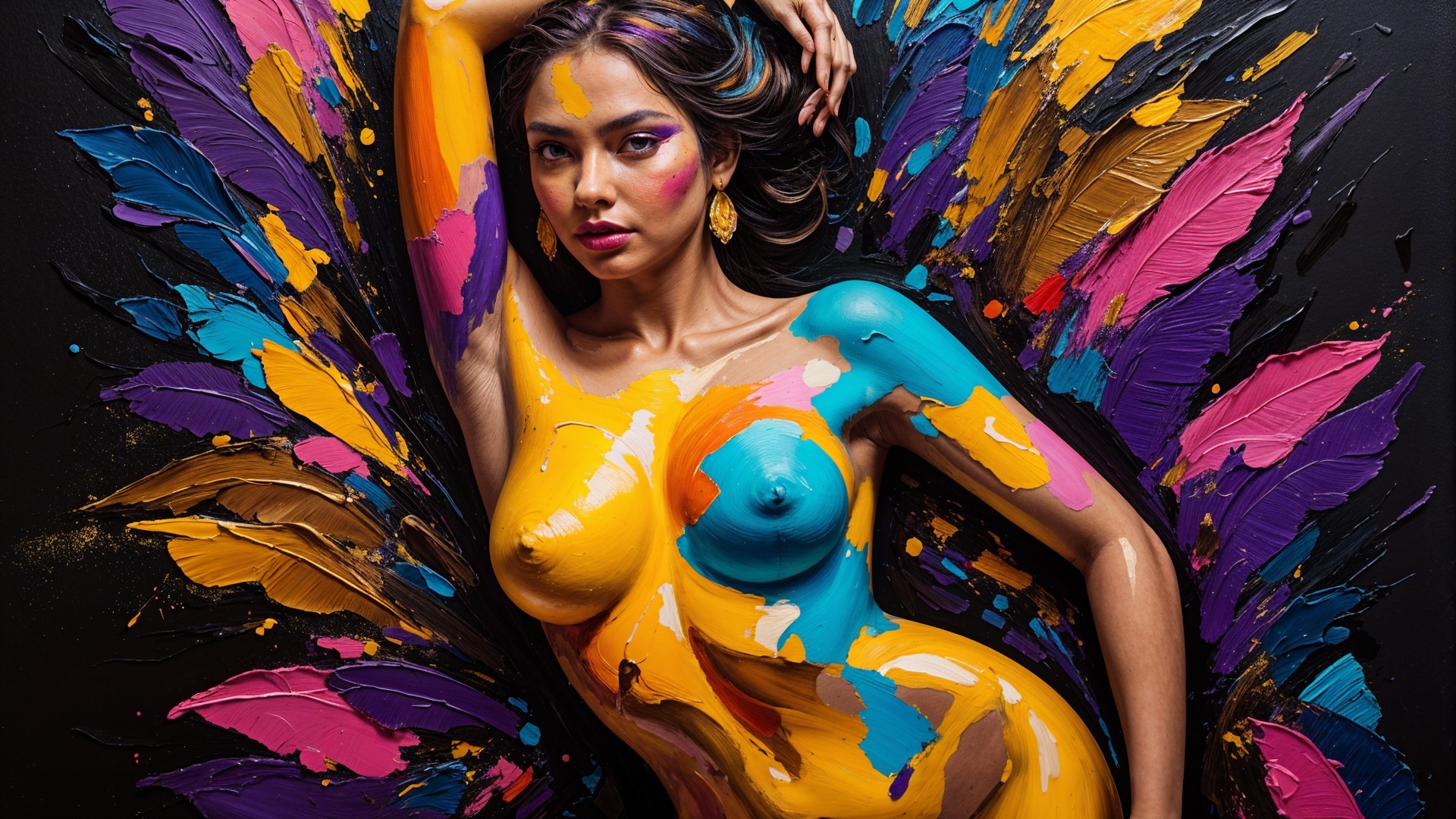 Prompt: bright coloures like yellow, orange, pink, turquoise and blue arranged in a way to suggest the shape of a woman, full body painting, dark background of colours of black, dark purple, brown and gold, as an oil on canvas painting, fragmented art, palette knife art, layered textures