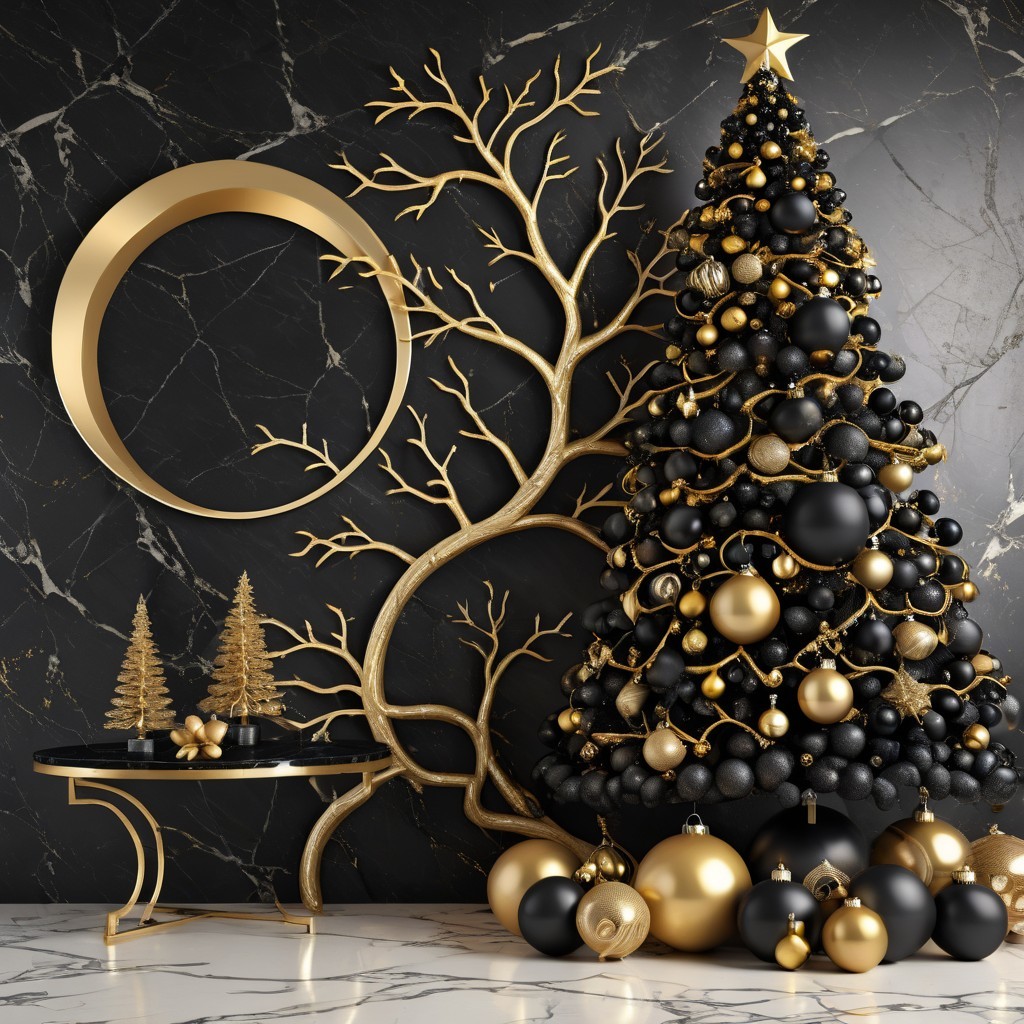 Prompt: A stunning 3D render showcases a "shimmering black and gold Christmas tree ornaments" in "diverse shapes and sizes," each displaying "intricate patterns" that catch the eye, meticulously arranged on a luxurious "black marble table." Delicate "golden branches" arch gracefully behind the tree, softly framing the scene, while the backdrop features an "aged plaster wall" bathed in a "warm inviting glow," creating remarkable "visual depth" and a sense of festive grandeur. The composition emphasizes the luxurious atmosphere with subtle shadows dancing across the surfaces, enriching the rich tones of black and gold.