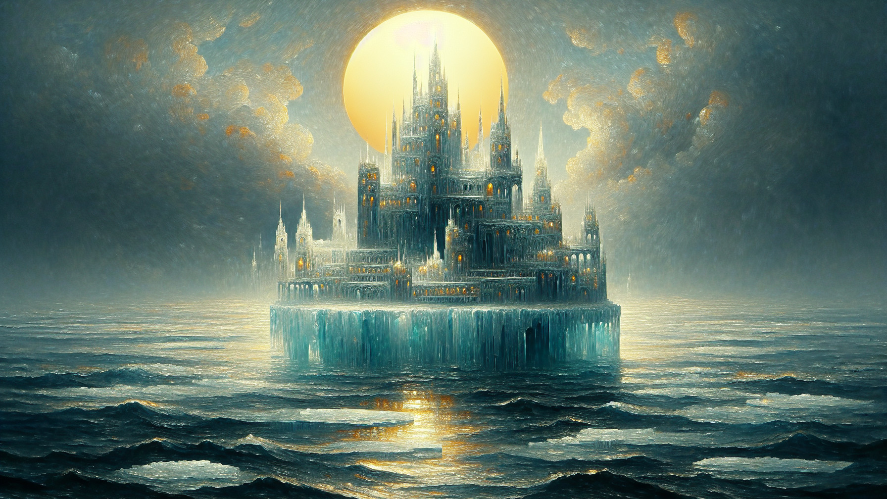 Prompt: A masterpiece of fantasy realism. A beautiful medieval castle made of transparent ice floats on a huge floe in the northern sea. The bright disk of the sun is visible in the foggy sky.