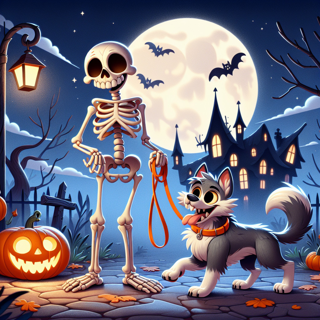 Prompt: A whimsical Halloween scene featuring a friendly skeleton walking a playful wolf on a leash. The background includes a spooky silhouette of a haunted house, a large full moon illuminating the night sky, and a flying bat. In the foreground, there is a carved pumpkin with a cheerful expression, set against an orange and dark purple color palette. The overall atmosphere is fun and lighthearted, perfect for a Halloween-themed illustration.