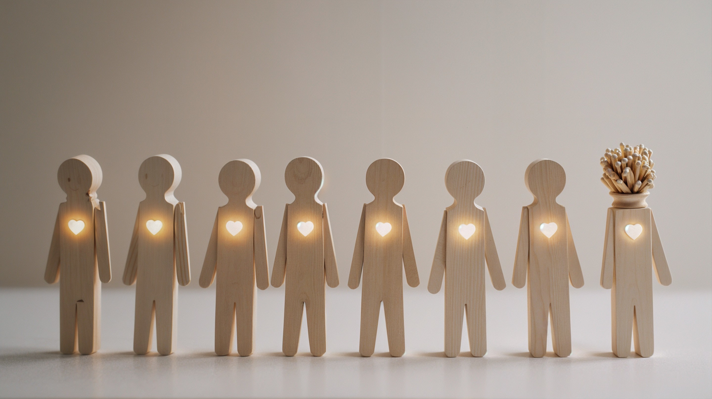 A minimalistic and symbolic scene showing several (10) children represented as figures composed of small wooden matchstick pieces carefully arranged to form their bodies. Next to them stands a single matchstick figure , clearly distinct from the others to symbolize diversity. Despite the differences, every child and the single matchstick figure have the same identical glowing heart — a small, warm, softly illuminated light at the center of their chests. The composition is simple, clean, emotional, highlighting both diversity and the fundamental equality of hearts and souls. Soft lighting, neutral background, gentle shadows, poetic and evocative atmosphere.