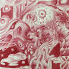 Prompt: "Closeup portrait of a beautiful sad woman with an elegant pose, wearing a flowy, of the shoulder, long-sleeved red gown with intricate, wispy folds and subtle textures, clean line art, conveyed through expressive rough textured charcoal sketch marks, with visible deckle edges and subtle ripped and torn tears, infused with the emotional intensity of Egon expressive lines, the opulent details of Gustav Klimt's symbolic ornamentation, and the flowing organic curves of Alphonse Mucha's Art Nouveau style, with bold contrasts and loose hatching."