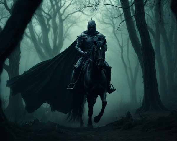Prompt: The black horseman, shrouded in a flowing cape that rippled like smoke in the dense fog, moved through the twisted trees, his armor glinting ominously in the faint light