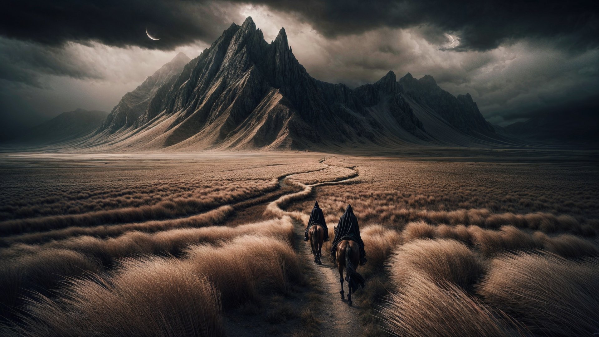 Prompt: wide shot captures two ominous, cloaked figures on horseback, seen from behind, as they journey along a rugged, winding path through a vast, dry grass field. The path leads towards a towering, jagged mountain peak that dominates the background. The sky above is dark and stormy, with a sliver of crescent moon barely visible through the heavy clouds, casting a dim, dramatic light on the scene. The overall atmosphere is desolate and mysterious.