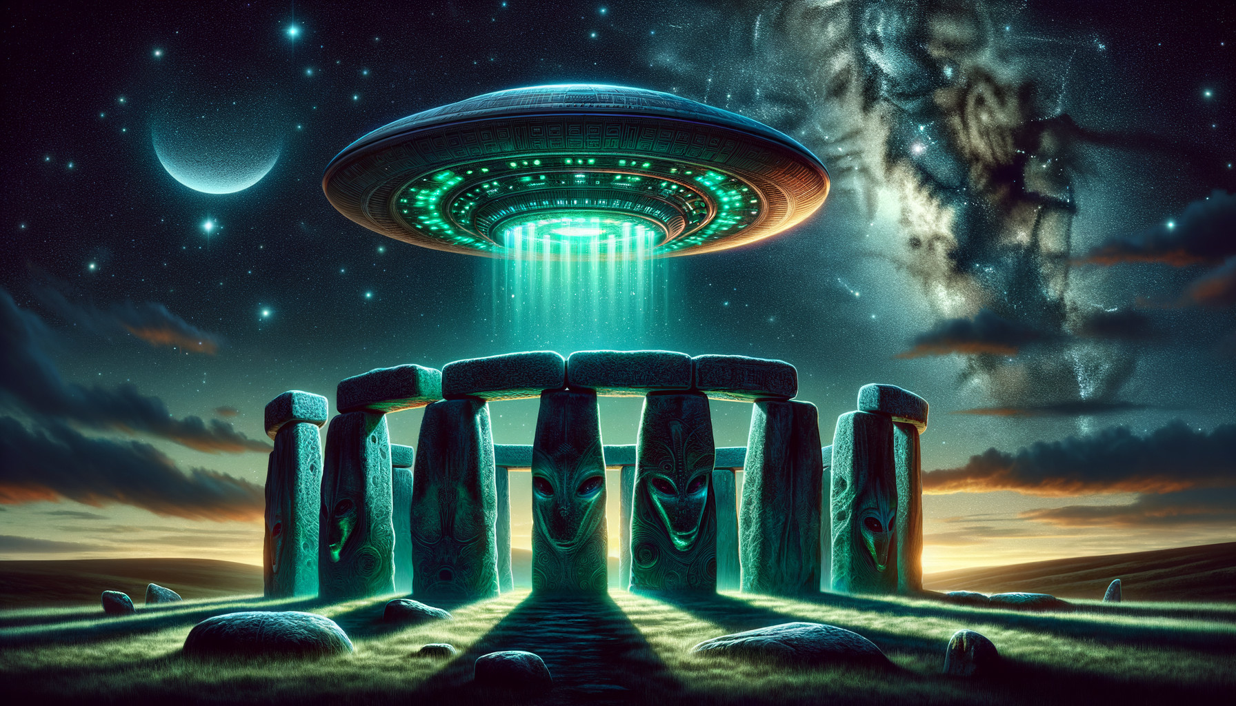 Prompt: Ancient mystical archway with detailed carvings and statues perched atop a cliff amidst towering, rocky mountains, beneath a sky with a planet visible in the distance and a comet streaking through. A waterfall cascades from a river above through the center of the arch into a serene pool below, surrounded by lush vegetation and vibrant flowers. Stone pathways lead to the foreground, suggesting a hidden sanctuary of an advanced lost civilization.